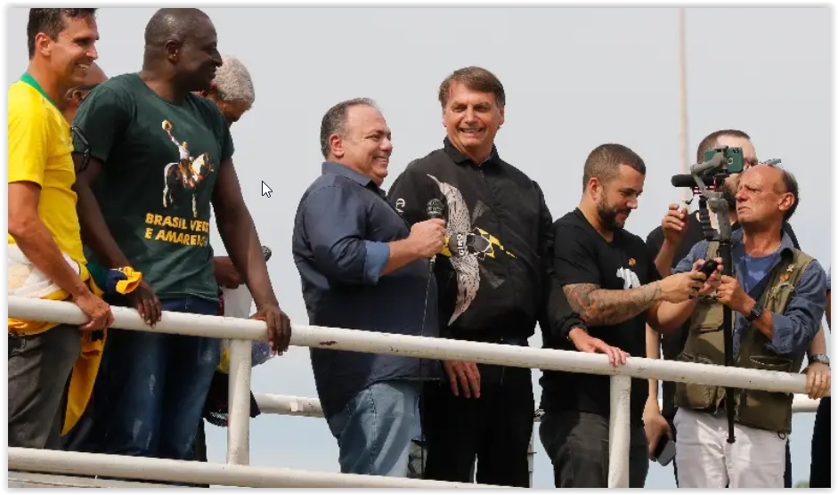 “E aí, galera […] eu não podia perder este passeio de moto de jeito nenhum. Tamo junto, hein. […]Parabéns pra galera que está aí, prestigiando o Presidente”. General da ativa Eduardo Pazuello em discurso aos “moto-fascistas” no Rio de Janeiro em 23/5/2021.