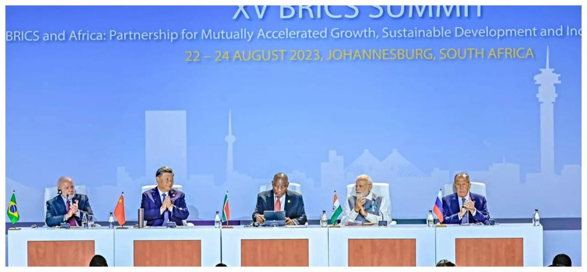 Da esquerda para a direita: presidentes Lula, Xi Jinping, Cyril Ramaphosa, o primeiro-ministro da Índia, Narendra Modi, e o ministro das Relações Exteriores da Rússia, Sergey Lavrov Foto: Ricardo Stuckert/PR