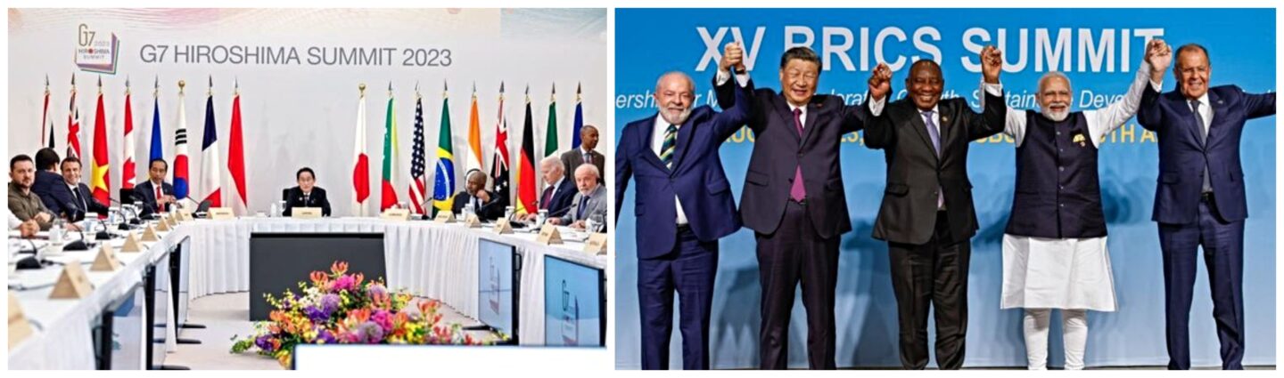 O primeiro, o G7, liderado pelos EUA, teria uma visão de futuro centrada em um unilateralismo coercitivo e belicoso. Já o segundo, o BRICS, recentemente expandido, teria uma visão estratégica centrada, essencialmente, na cooperação multipolar.