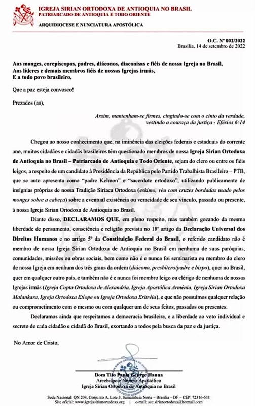 “Diante disso, esclarecemos que, em pleno respeito, mas também gozando da mesma liberdade de pensamento, consciência e religião prevista no 18º artigo da Declaração dos Direitos Humanos e no artigo 5º da Constituição Federal do Brasil, o referido candidato não é membro de nossa Igreja Sirian Ortodoxa de Antioquia do Brasil em nenhuma de suas paróquias, comunidades, missões ou obras sociais”, revela a nota.