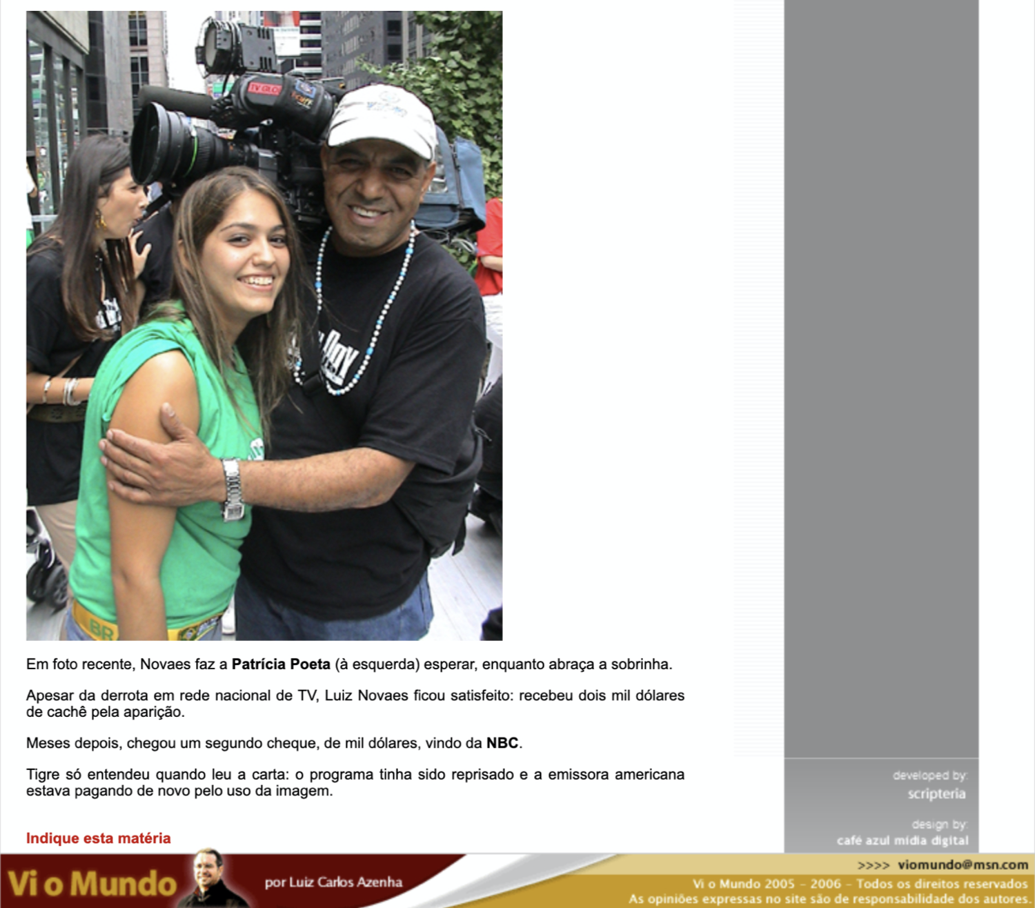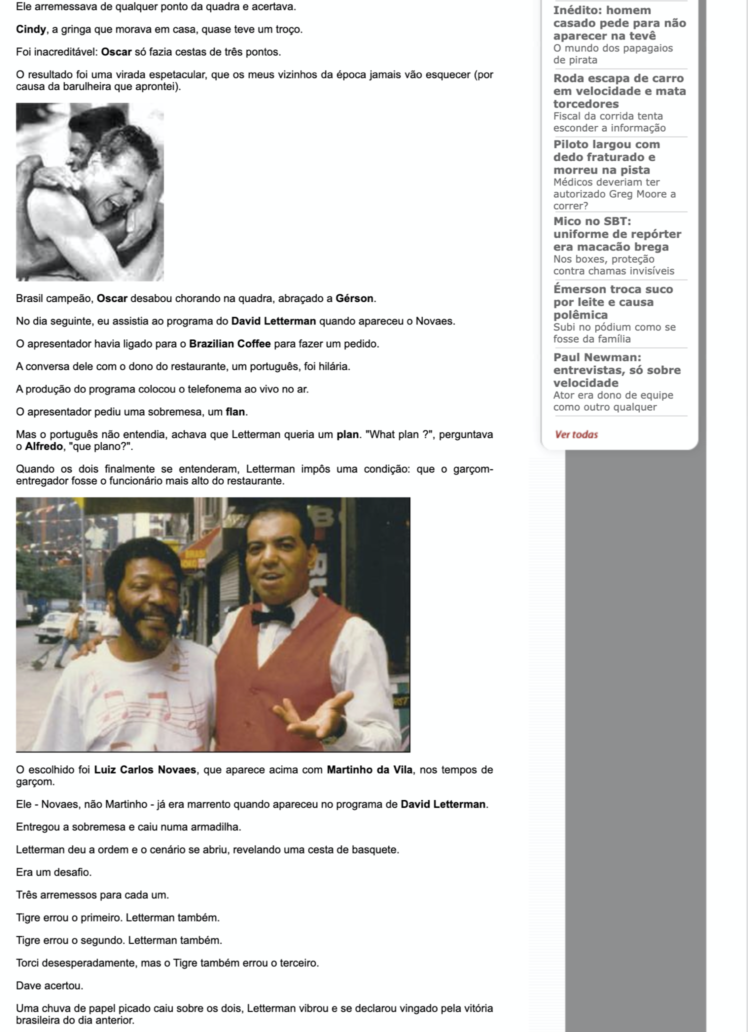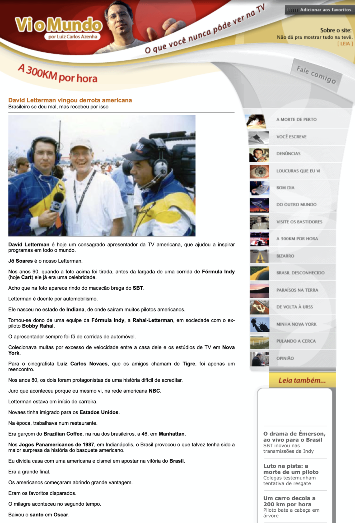 Recuperado do Viomundo na Globo.com via Wayback Machine, capturado pela primeira vez em 25.04.2005. A vitória do Brasil sobre os Estados Unidos nos Jogos Panamericanos, narrada no texto, foi em 27.08.1997. Mencionada no texto, Patrícia Poeta era repórter da TV Globo em Nova York. Letterman, hoje aposentado da NBC, fez uma série na Netflix.