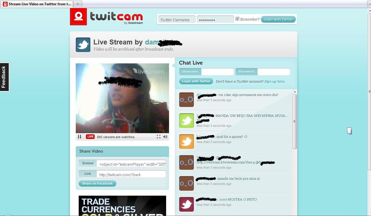 Numa rápida passagem pelo twitter nesta tarde, com uma coluna aberta para pesquisa, vi chamadas para várias twitcams. Numa, duas adolescentes foram bastante xingadas, porque abriram a twitcam para conversar e não tiraram a roupa.