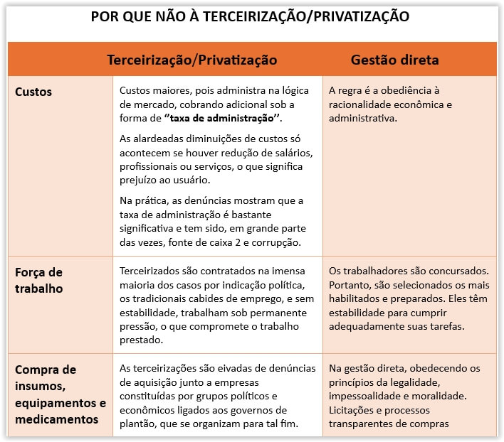 3. A privatização, apregoada aos quatro ventos como “legal” e que, portanto, os movimentos contrários não se justificariam, é uma opção política do gestor. E onde ela foi implantada, além de não resolver os problemas que existiam, criaram outros bem mais graves, aprofundando um violento processo de destruição do SUS e do Estado brasileiro.