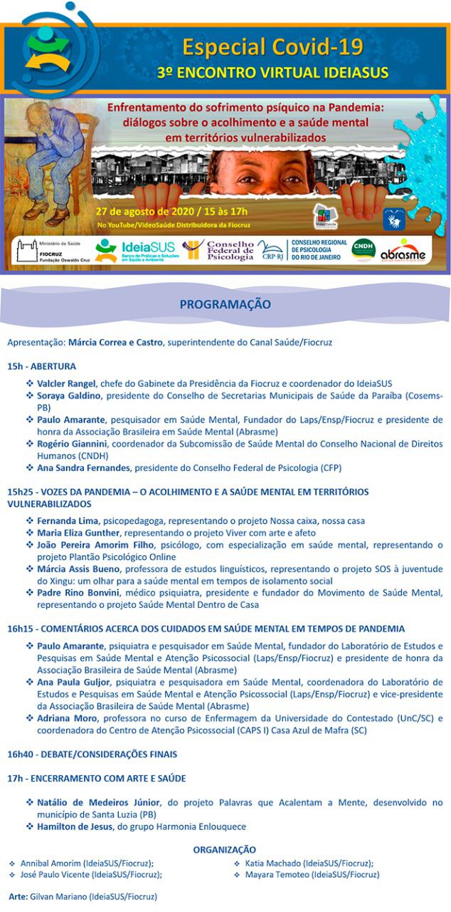 Nesta quinta-feira, 27/08, aconteceu o 3º Encontro Virtual IdeiaSUS, que teve como tema ‘‘Enfrentamento do sofrimento psíquico na pandemia: diálogos sobre o acolhimento e a saúde mental em territórios vulnerabilizados”.