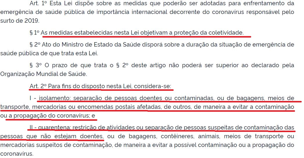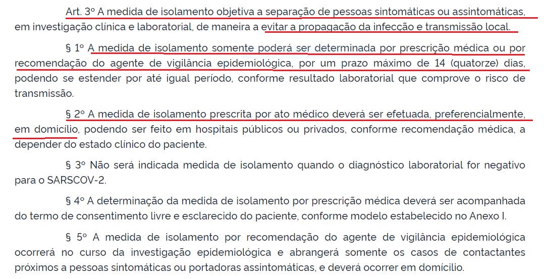 O artigo 3º e seus cinco parágrafos (veja abaixo) tratam exatamente do isolamento da pessoa sintomática ou assintomática, em investigação clínica e laboratorial de infecção pelo coronavírus.