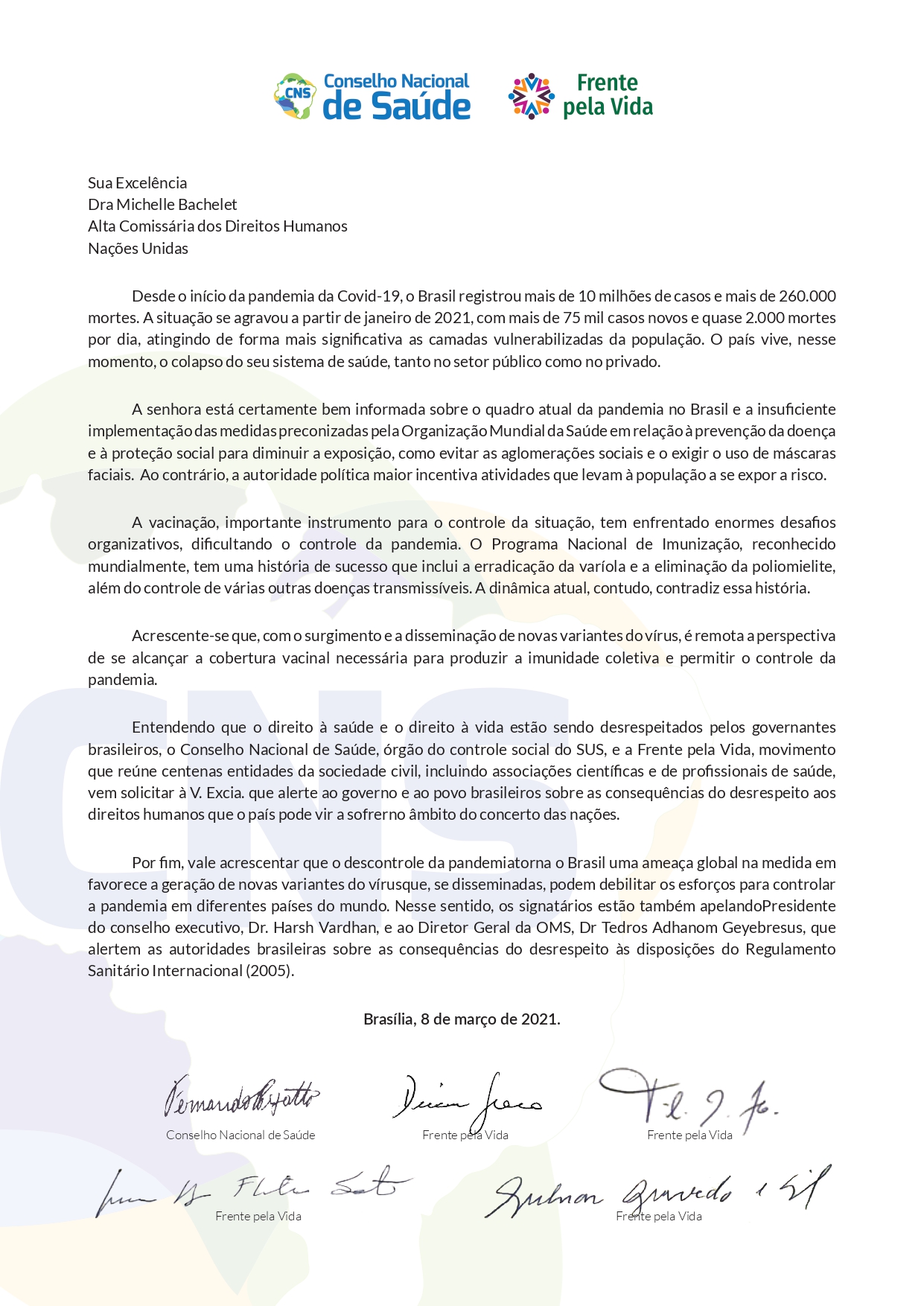 A carta apela que Conselho dos Direitos Humanos da ONU alertem o governo para as possíveis retaliações que o Brasil pode sofrer por desrespeitar as normas sanitárias internacionais e os direitos humanos.