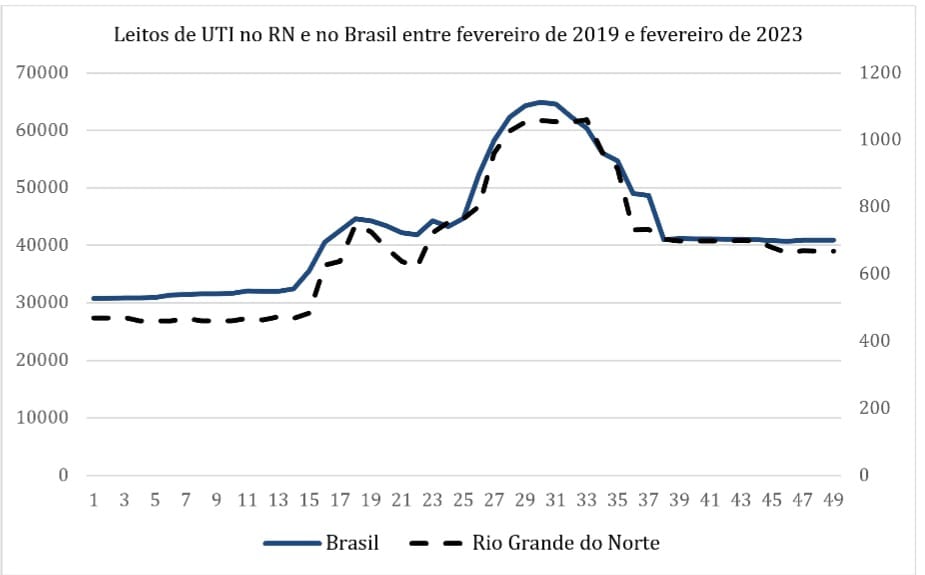 De fato, os números do CNES para leitos complementares mostram que em termos proporcionais e em decorrência da pandemia de COVID-19 o RN foi o 13º de 27 estados totais, com 42% de aumento no número de leitos complementares, numa escala que coincidentemente teve uma média de aumento percentual entre 2019 e 2023 de 40% (Ministério da Saúde, DATASUS, CNES, Recursos Físicos/Leitos Complementares).