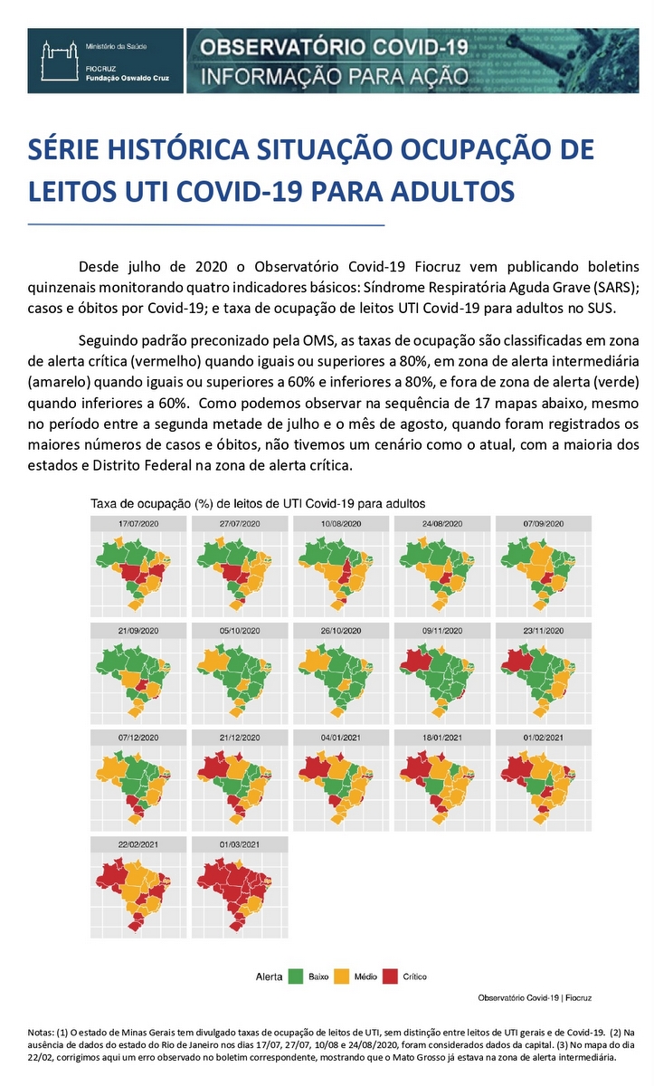 Desde julho de 2020, o Observatório Covid-19 Fiocruz vem publicando boletins quinzenais monitorando quatro indicadores básicos: Síndrome Respiratória Aguda Grave (SRAG); casos e óbitos por Covid-19; e taxa de ocupação de leitos UTI Covid-19 para adultos no Sistema Único de Saúde (SUS).