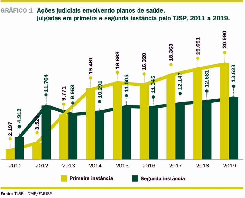 Em estudo anterior do DMP/FMUSP, em seleção de 4.000 decisões de segunda instância do TJSP contra planos de saúde, conclui-se que em 92,4% dos acórdãos foi dada razão ao usuário, sendo que em 88% dos casos o pleito foi integralmente acolhido e em outros 4,4% a pretensão foi acolhida em parte.