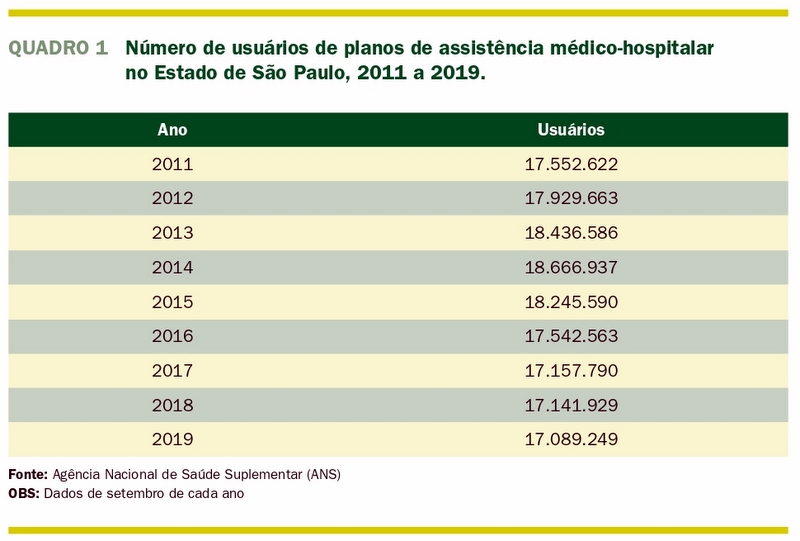 Em setembro de 2019 foram registradas 17.089.249 pessoas cobertas no estado, número abaixo das 17.552.622 pessoas com planos de saúde em São Paulo em setembro de 2011.