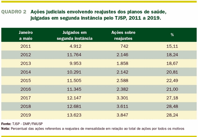 Em 2011, as ações envolvendo reajuste de mensalidade representavam 15,1% do total de ações julgadas (Quadro 2).