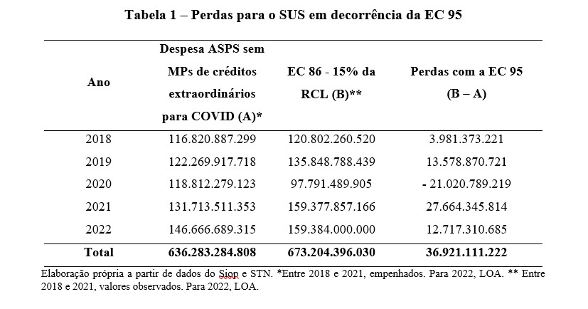 Comparando-se os valores empenhados em saúde (exceto as Medidas Provisórias para a Covid, não contabilizadas no teto de gasto) com os valores mínimos que seriam aplicados caso a EC 95 não estivesse em vigor (15% da Receita Corrente Líquida, nos termos da EC 86/2015), estima-se a perda para o SUS em R$ 36,9 bilhões entre 2018 e 2022, conforme a tabela 1.