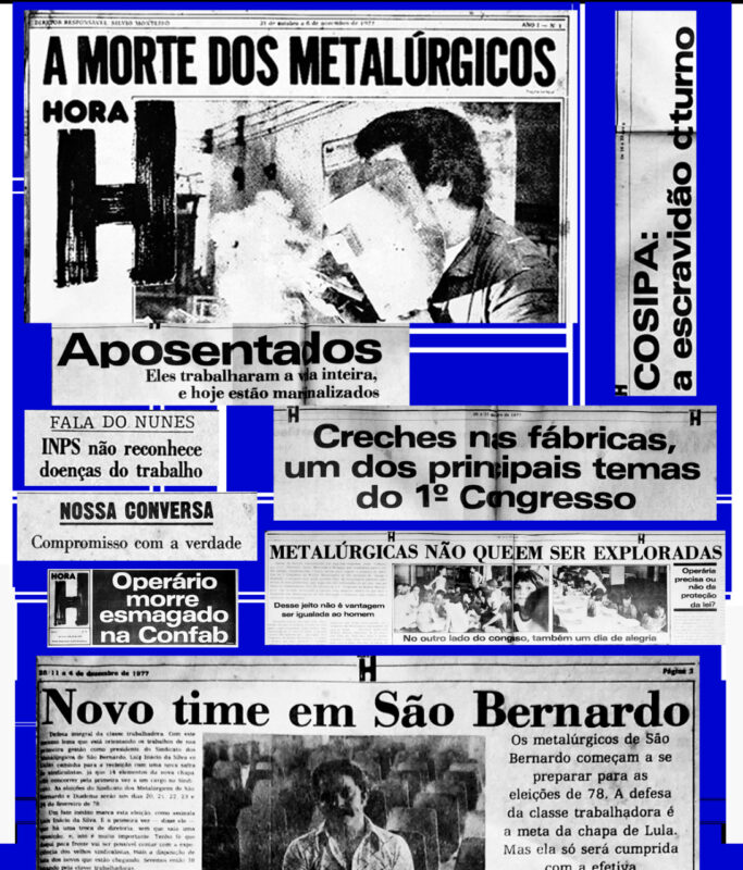 Mosaico de manchetes do Hora H, lançado no ABC em 31 de outubro de 1977. Lula só se tornaria presidente dos Metalúrgicos de São Bernardo nas eleições que ocorreram em 1978. Arte: Carlos Lopes