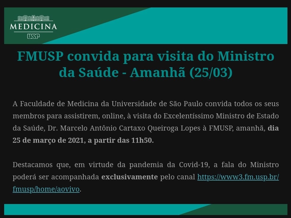 Nessa quarta-feira (24/03), os médicos do Hospital das Clínicas de São Paulo receberam no e-mail a mensagem da Faculdade de Medicina da USP (FMUSP) informando sobre a visita do ministro da Saúde, Marcelo Queiroga, à instituição nesta quinta.