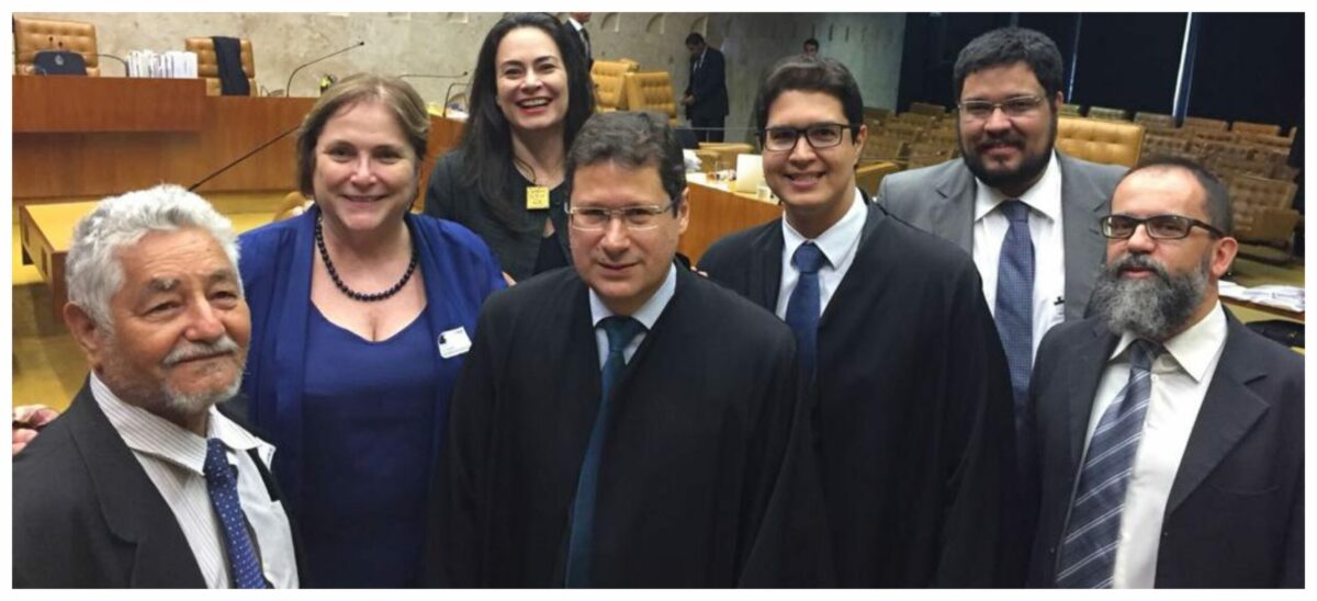 Juntos na batalha contra o amianto no STF em 2017: à esquerda, Eliezer João de Souza (presidente da Abrea), Fernanda Giannasi (Rede Virtual-Cidadã pelo Banimento do Amianto) e Daniela Giacomet (procuradora do Estado do Rio de Janeiro); no centro, à frente, Mauro Menezes (advogado) e Luciano Lima Leivas (procurador do Trabalho); atrás, Gustavo Teixeira Ramos e Adovaldo Medeiros Filho (advogados). Foto: Abrea