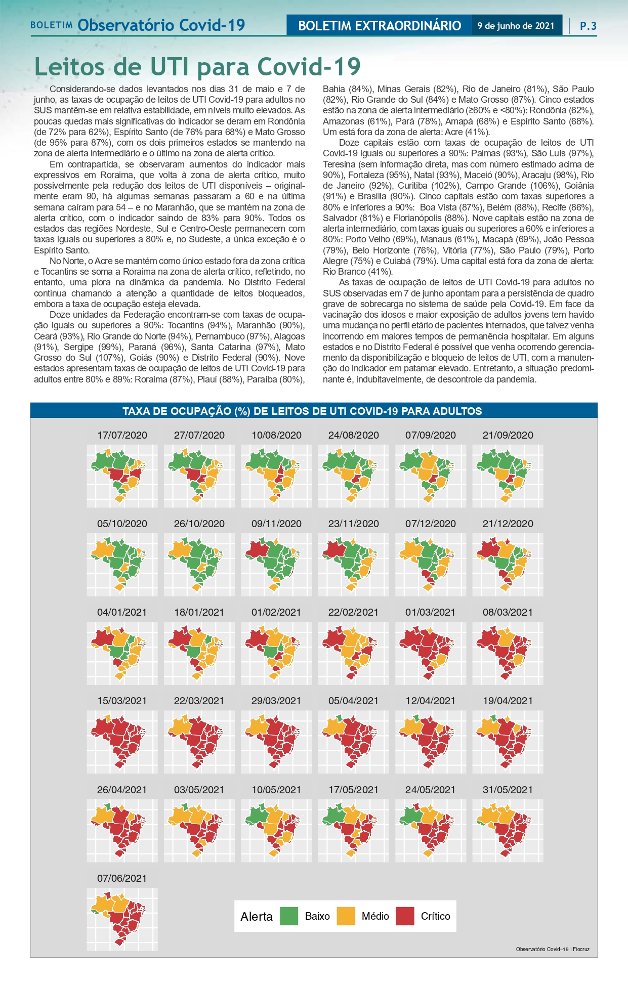 As taxas de ocupação de leitos de UTI Covid-19 para adultos no SUS observadas em 7 de junho apontam para a persistência de quadro grave de sobrecarga no sistema de saúde pela Covid-19.