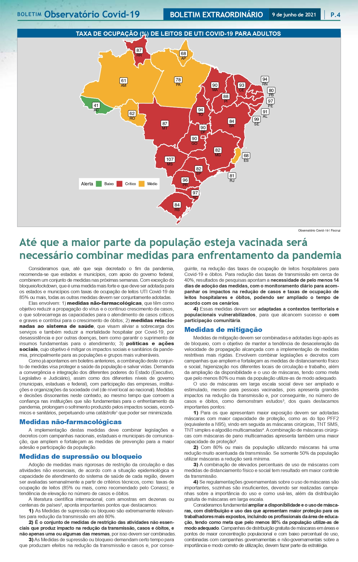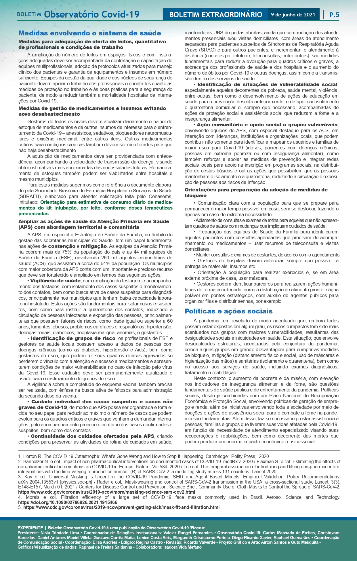 “É muito importante a utilização de medidas não-farmacológicas, que têm como objetivo reduzir a propagação do vírus e o contínuo crescimento de casos, o que sobrecarrega as capacidades para o atendimento de casos críticos e graves e contribui para o crescimento de óbitos; medidas relacionadas ao sistema de saúde, que visam aliviar a sobrecarga dos serviços e também reduzir a mortalidade hospitalar por Covid-19, por desassistência e por outras doenças, bem como garantir o suprimento de insumos fundamentais para o atendimento; as políticas e ações sociais, cujo objetivo é mitigar os impactos sociais e sanitários da pandemia, principalmente para as populações e grupos mais vulneráveis”.