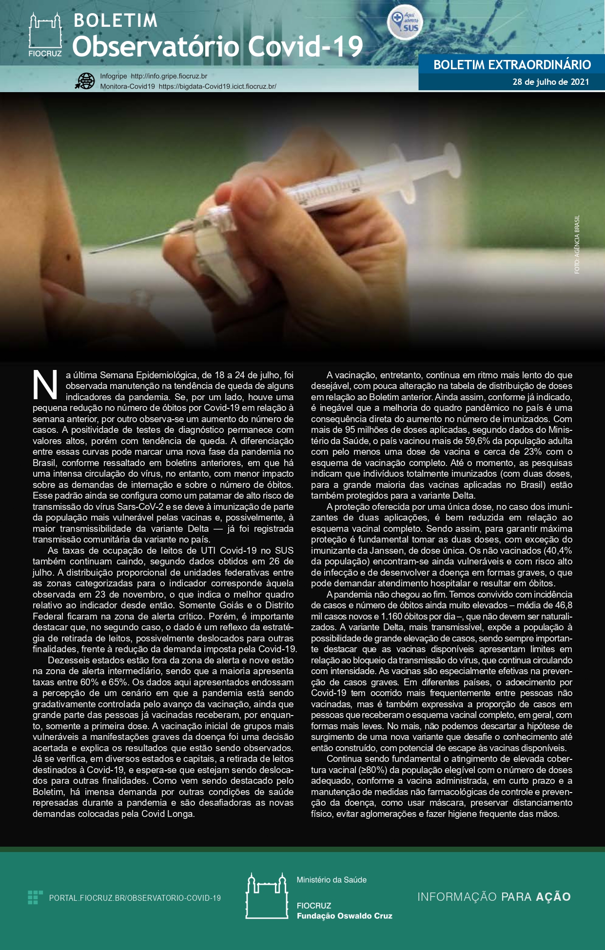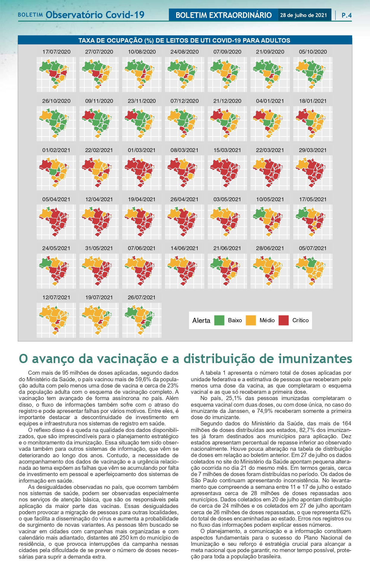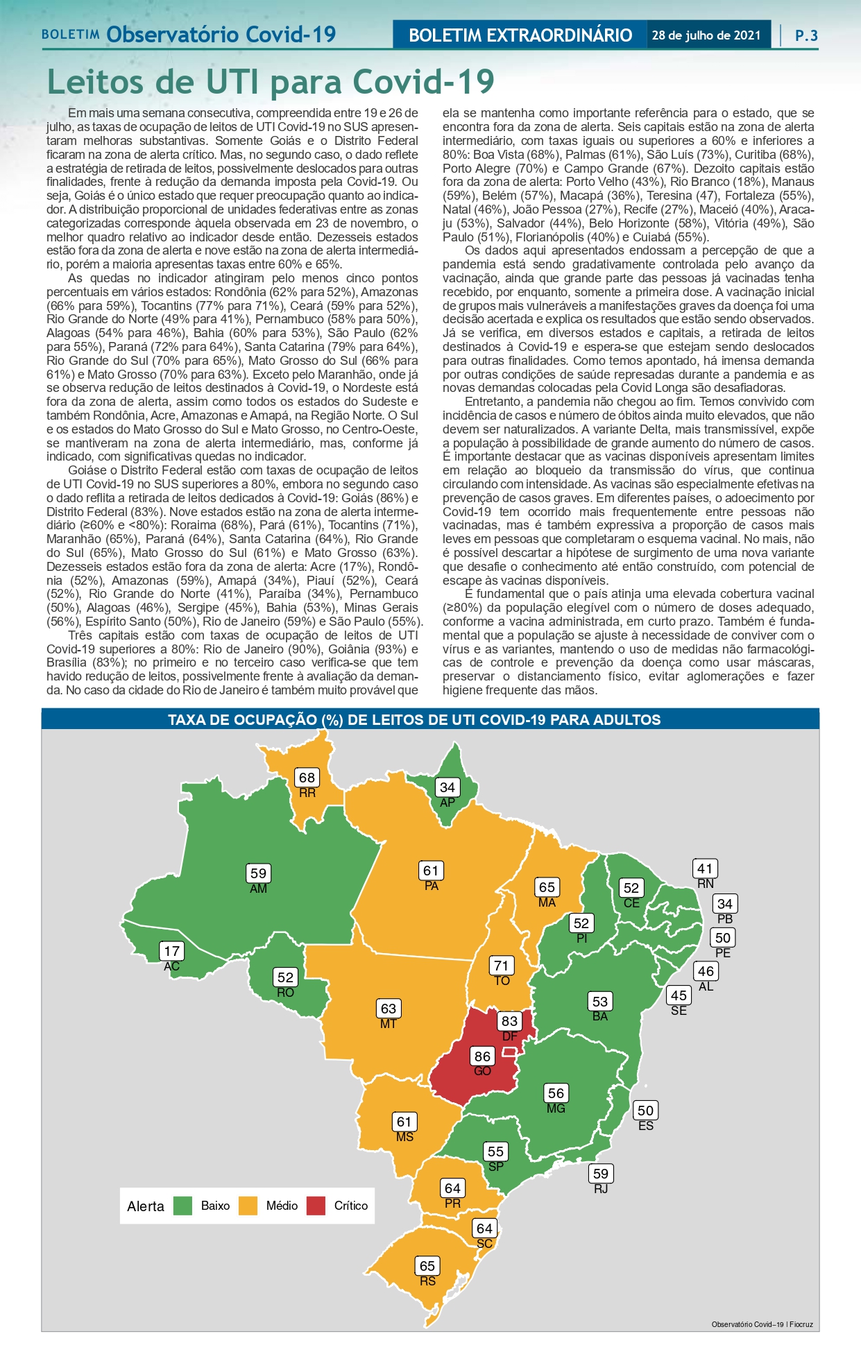 A nova edição do Boletim Observatório Covid-19 (na íntegra, ao final), publicada nesta quarta-feira (27/7), reafirma, por mais uma semana, tendência de queda no número de óbitos e nos indicadores de ocupação de leitos de UTI Covid-19 para adultos no SUS.