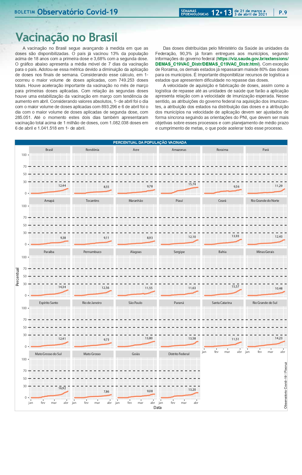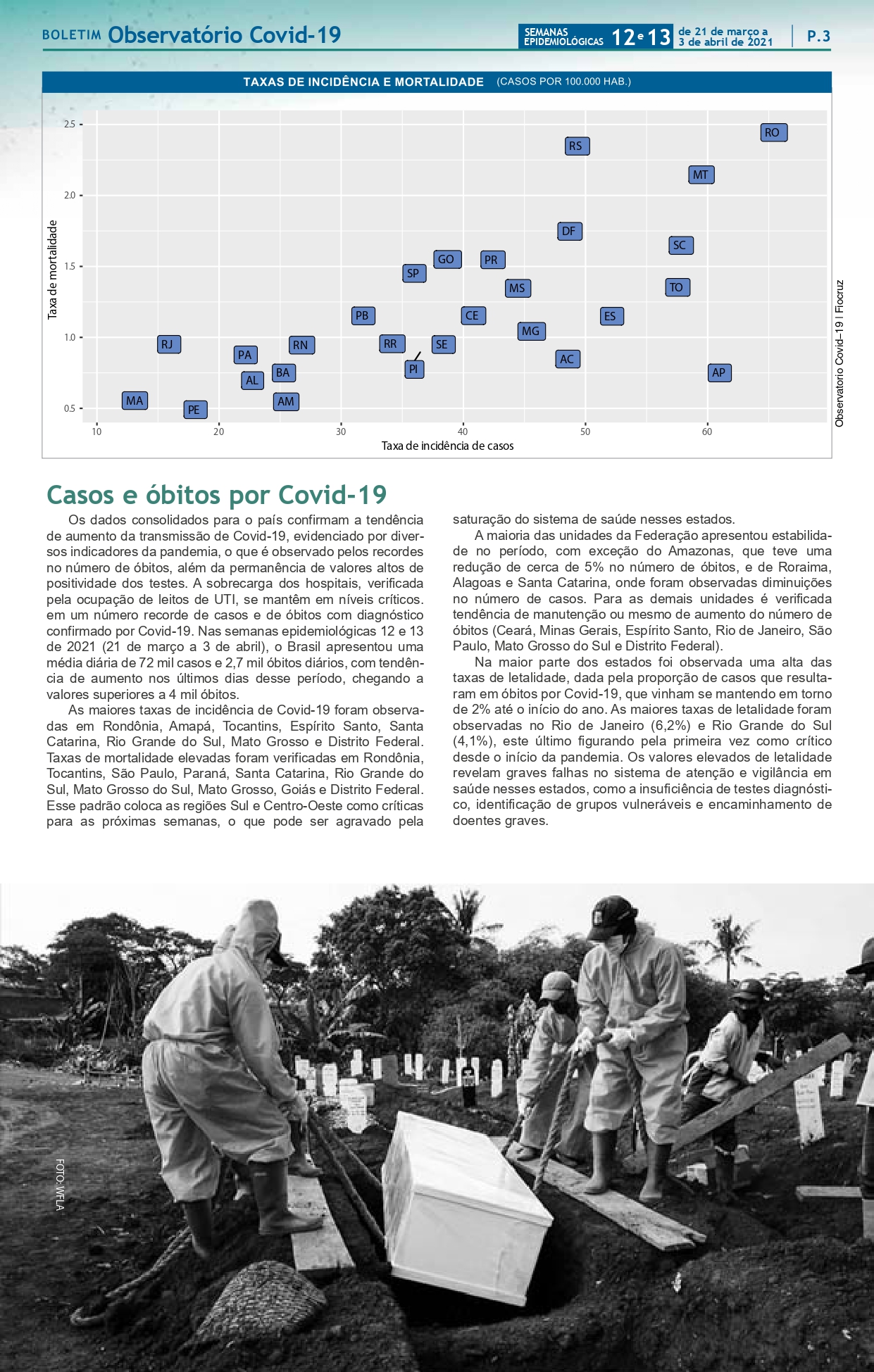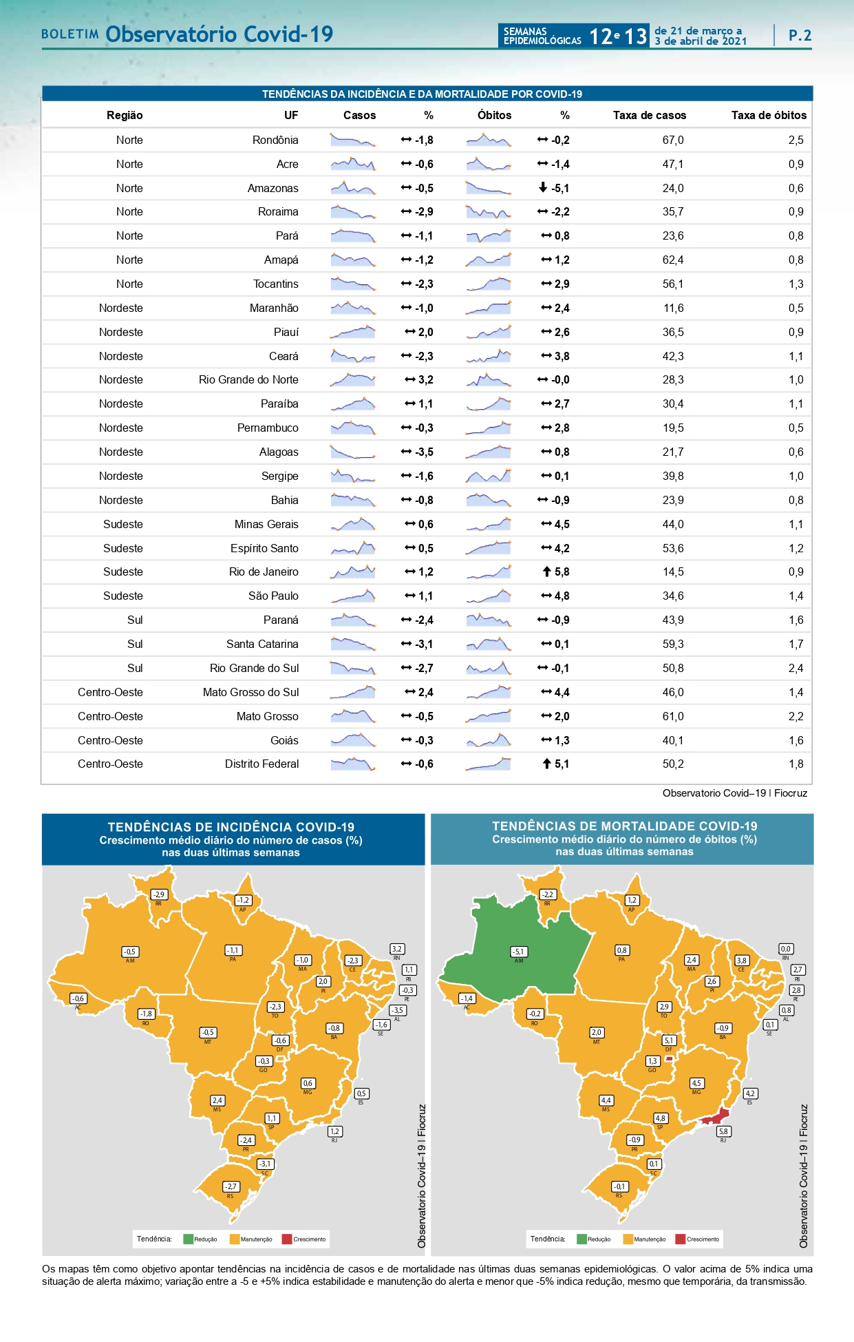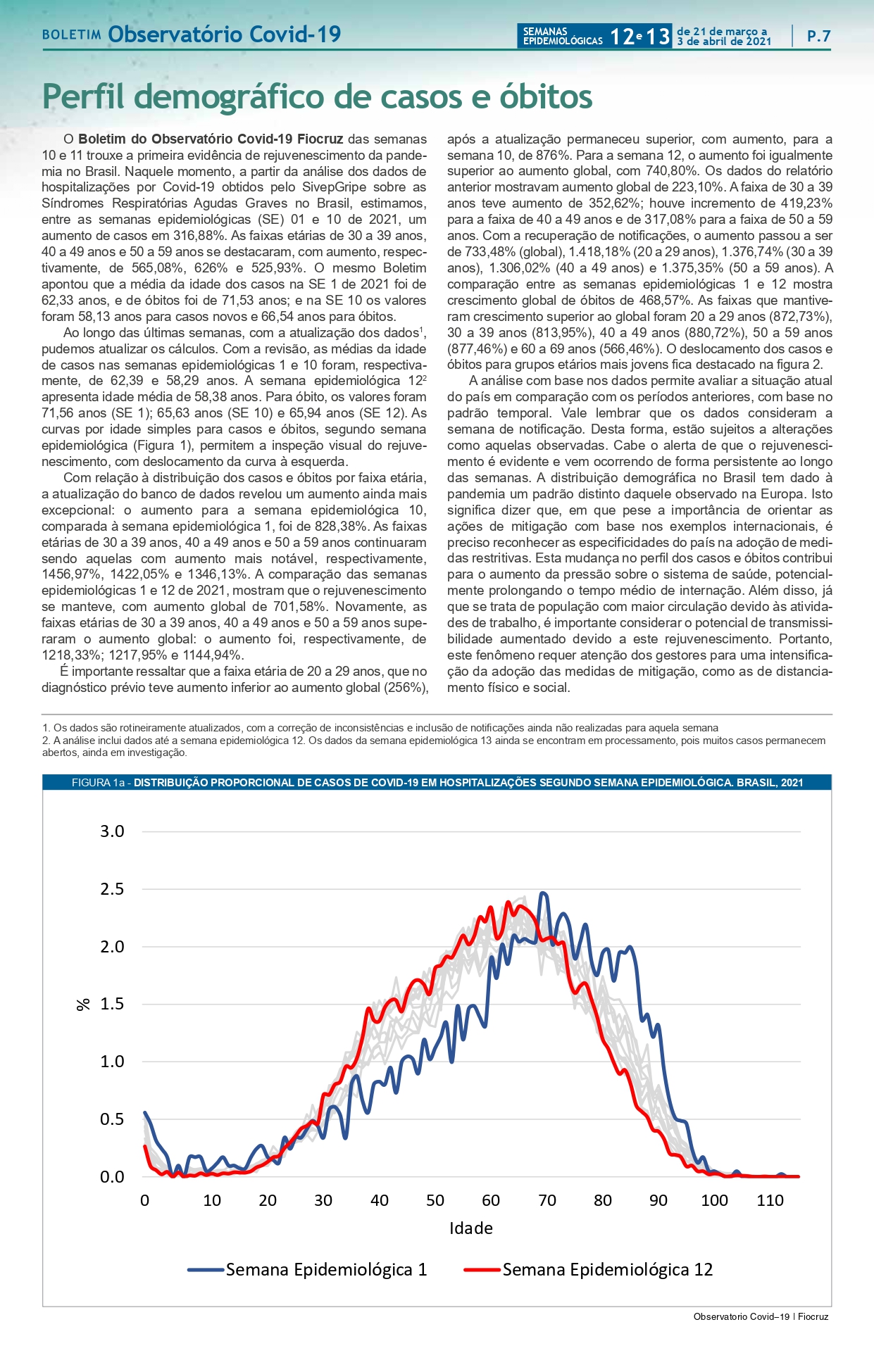 Além da manutenção do rejuvenescimento da pandemia no Brasil, a comparação entre a Semana Epidemiológica 1 (3 a 9 de janeiro de 2021) e a 12 (21 a 27 de março) sinalizou um aumento global da doença de 701,58%.