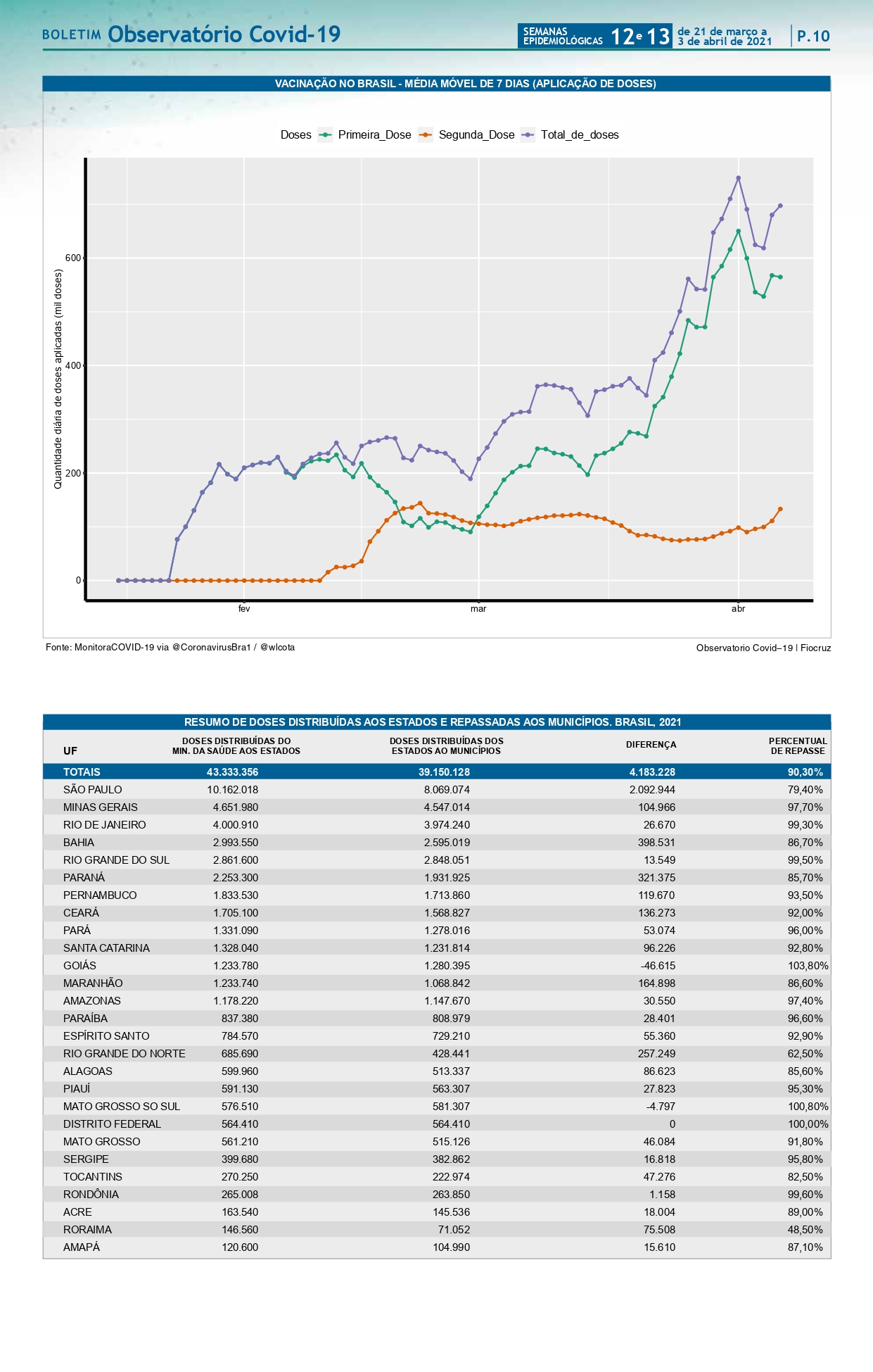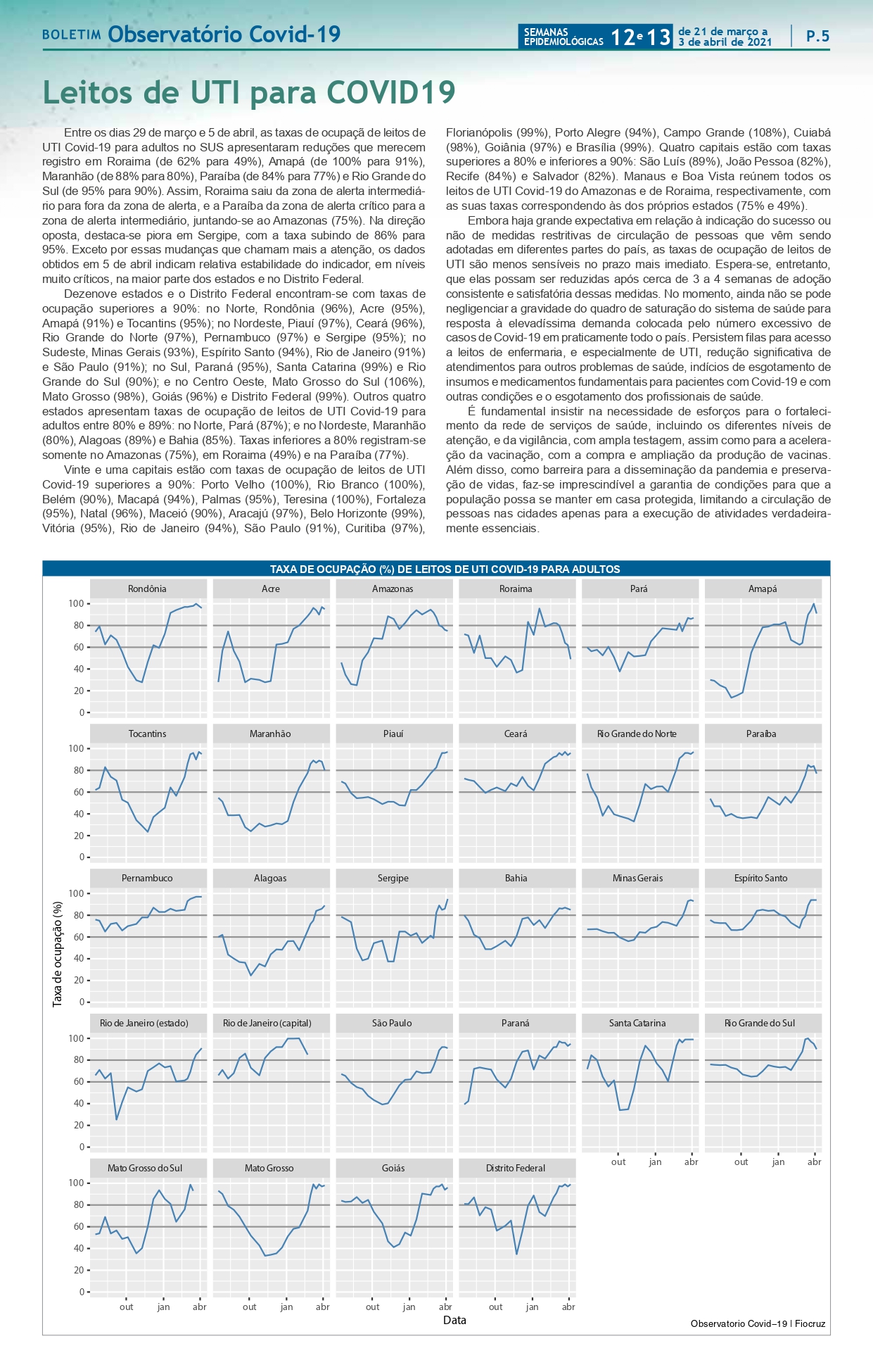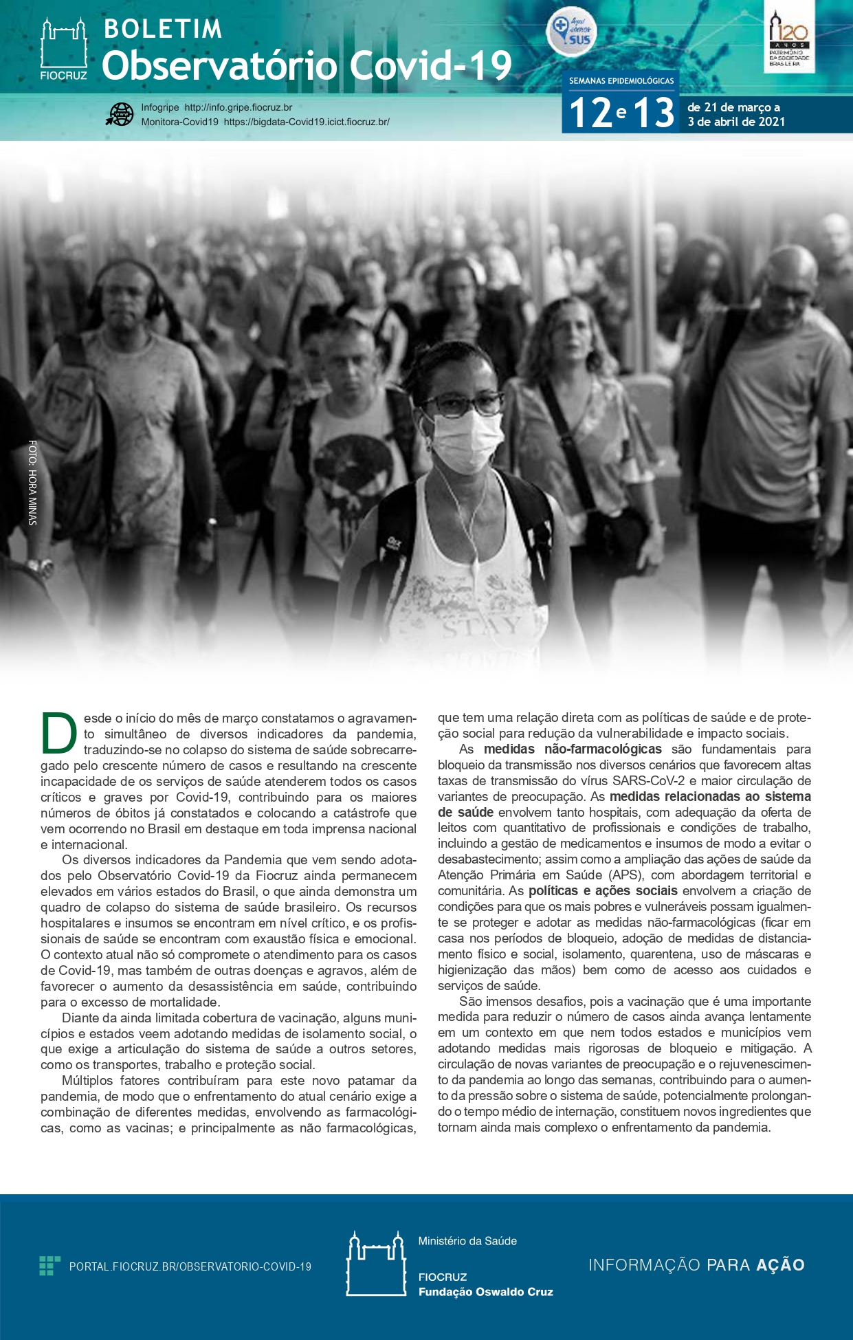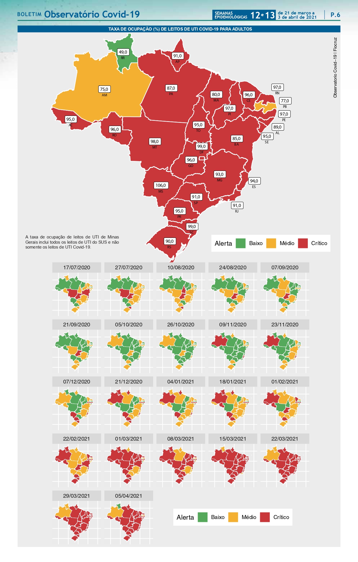 Além da manutenção do rejuvenescimento da pandemia no Brasil, a comparação entre a Semana Epidemiológica 1 (3 a 9 de janeiro de 2021) e a 12 (21 a 27 de março) sinalizou um aumento global da doença de 701,58%.