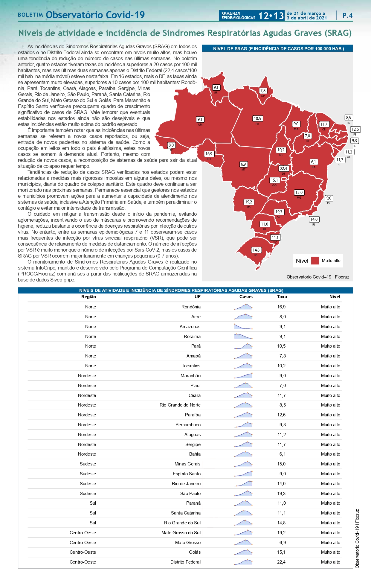 As maiores taxas de incidência de Covid-19, como mostra o Boletim, foram observadas nos estados de Rondônia, Amapá, Tocantins, Espírito Santo, Santa Catarina, Rio Grande do Sul, Mato Grosso e no Distrito Federal.