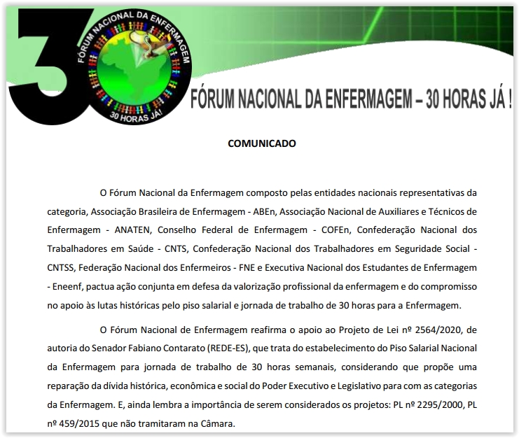 Nessa quinta-feira, 9/9, o Fórum Nacional de Enfermagem (veja comunicado abaixo) reiterou apoio ao PL do senador Fabiano Contarato. Afinal, repara dívida histórica dos poderes Executivo e Legislativo com as categorias da enfermagem.