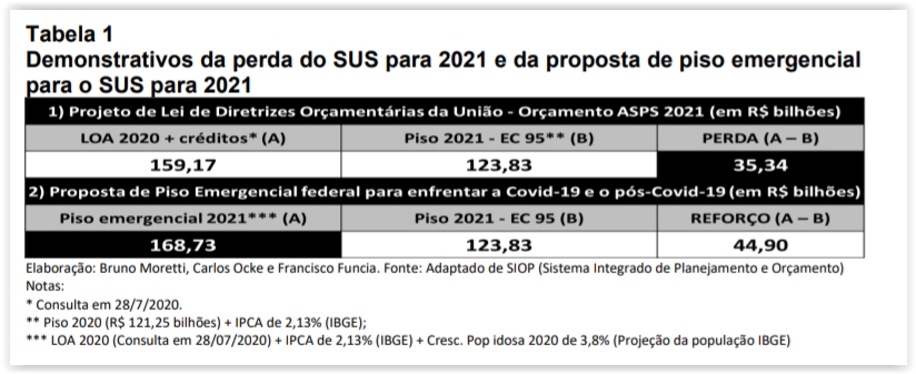 Por isso, também, o Conselho Nacional de Saúde defende nessa petição pública um piso emergencial de R$ 168,7 bilhões, sendo que esses valores foram demonstrados pelos economistas Bruno Moretti, Carlos Ocke e Francisco R. Funcia (Tabela 1, abaixo).