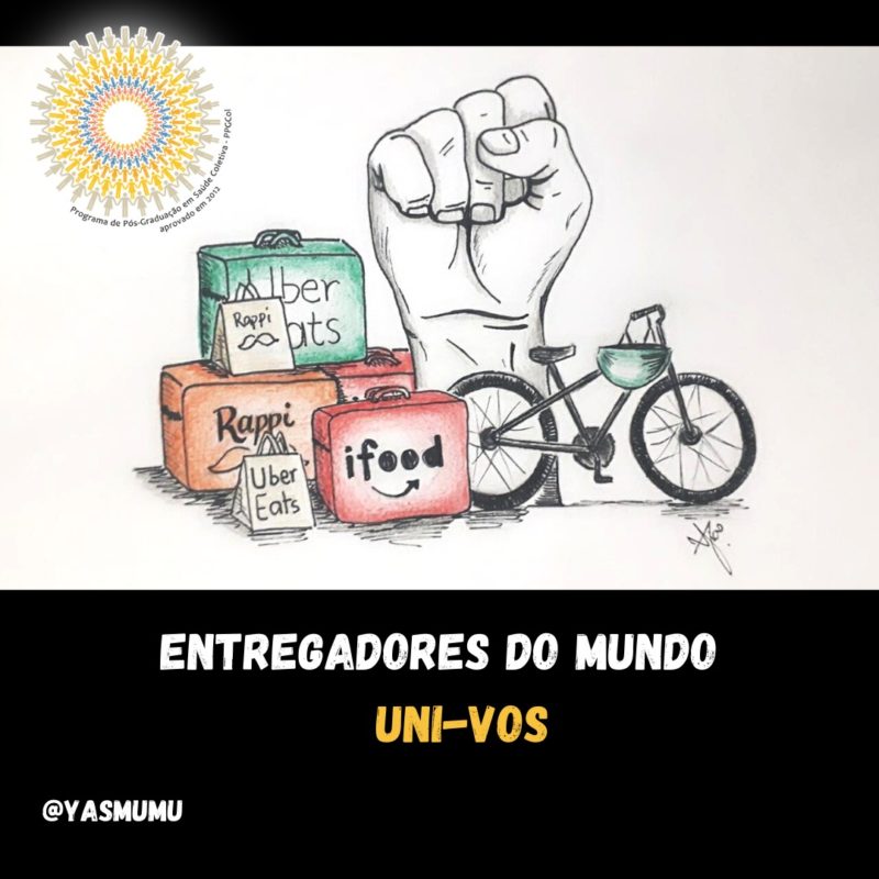 Card 9 Entregadores do Mundo, uni-vos. Os entregadores de aplicativos são extremamente vulneráveis à COVID-19 e a diversos outros agravos pela extensa jornada de trabalho. Ademais, habitualmente não recebem condições mínimas de proteção individual e tampouco estão assegurados por direitos trabalhistas. A precarização do trabalho traveste-se de empreendedorismo e colocam os entregadores e suas famílias em uma situação de vulnerabilidade social. Nesta perspectiva, apoiar os entregadores em suas causas, legitimar e fortalecer a necessidade de sindicalização, de união e de luta é uma estratégia de preservação de vidas e de defesa a saúde como um bem inalienável.