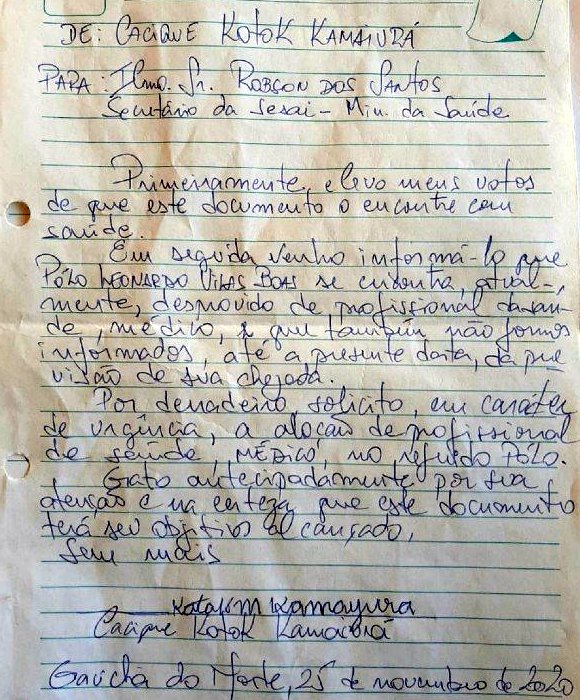 No dia 25 de novembro, o cacique Kotok, do povo Kamaiurá, escreveu uma carta ao secretário de Saúde Indígena, Robson Santos, para pedir, em caráter de emergência, a vinda de um médico para o Polo Leonardo. Kotok não menciona as condutas de Dr. Celso, que está afastado, mas também não pede para que ele retorne.