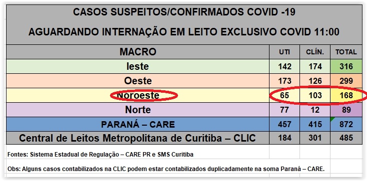 Ontem, 168 pessoas aguardavam na fila por internação. Desse total, 65 precisavam de UTI. Confira no quadro abaixo