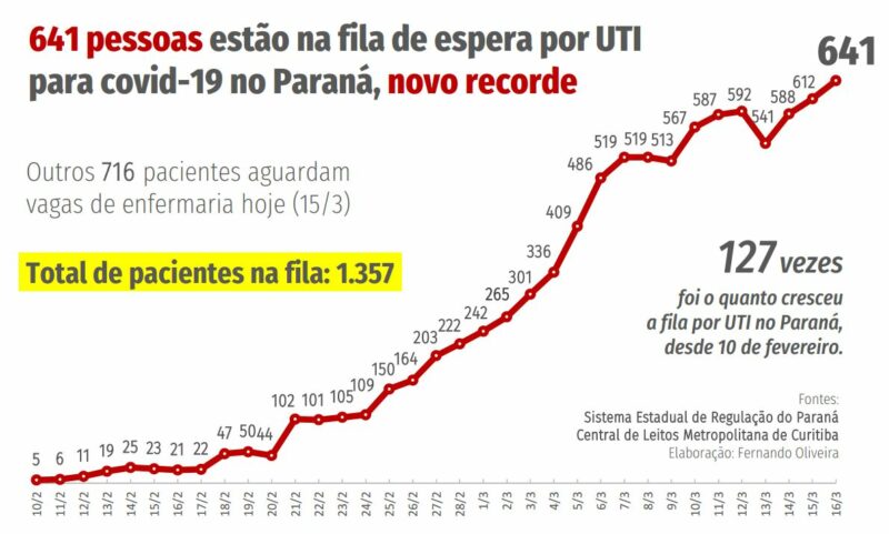 Ontem (16/03), o tamanho da fila para internação no Paraná era o mesmo da segunda-feira: 641 à espera de leito em UTI e 716, para vaga em enfermaria.