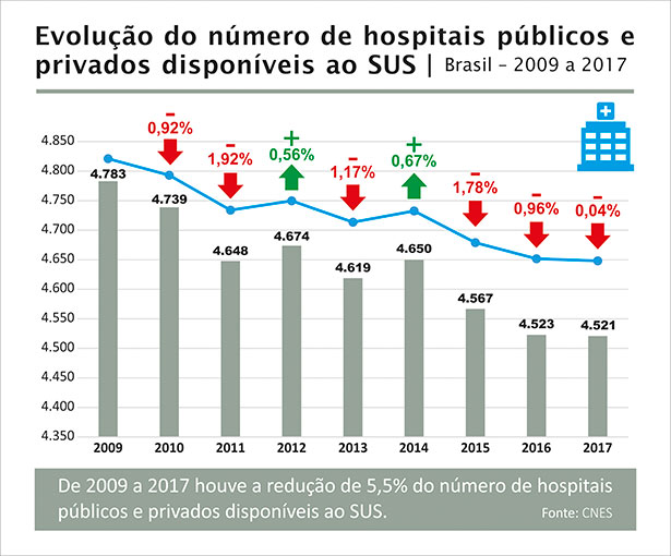 Segundo os dados do Proadess, houve uma redução de 3,7%, o que significa que se em 2009 haviam 6.041 hospitais, este número cai para 5.819 unidades oito anos depois.