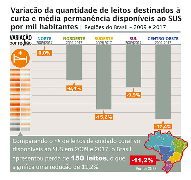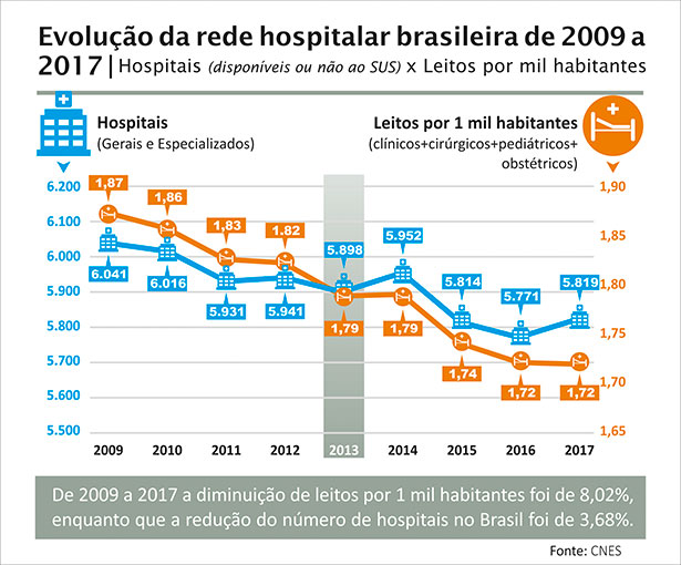 Já o número de leitos hospitalares (clínicos, cirúrgicos, pediátricos e obstétricos) também acompanhou a queda: de 1,87 por cada mil habitantes para 1,72 por mil habitantes, número inferior ao estabelecido pela Portaria GM/MS n° 1101/2002 (vigente até 1º outubro de 2015), que era de 2,5 a 3,0 leitos por cada mil habitantes.