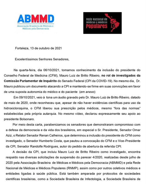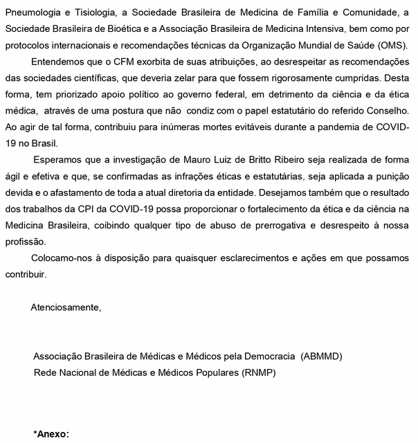 Saúde Médicos apoiam CPI da Covid por investigar presidente do CFM: Mauro Ribeiro contribuiu por inúmeras mortes evitáveis na pandemia; íntegra da nota 13/10/2021 - 15:03 Tempo de leitura: < 1 min Jair Bolsonaro e o presidente do CFM, Mauro Ribeiro. Foto: Divulgação Apoie o VIOMUNDO R$ 5 R$ 15 R$ 35 Qualquer valor Siga-nos no