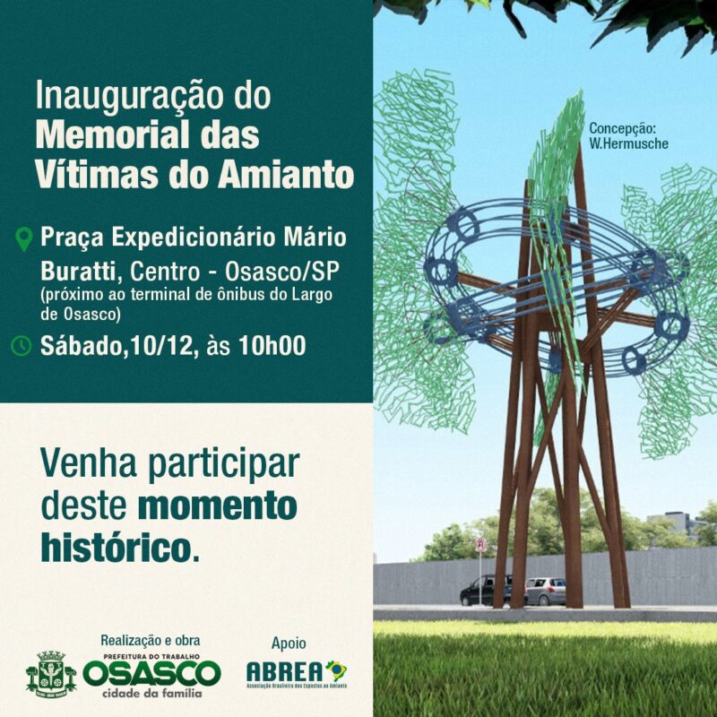 A Prefeitura de Osasco, por meio da Secretaria de Emprego, Trabalho e Renda (SETRE), em parceria com a ABREA (Associação Brasileira dos Expostos ao Amianto), entrega no dia 10 de dezembro, às 10h, um memorial em homenagem às vítimas do amianto.