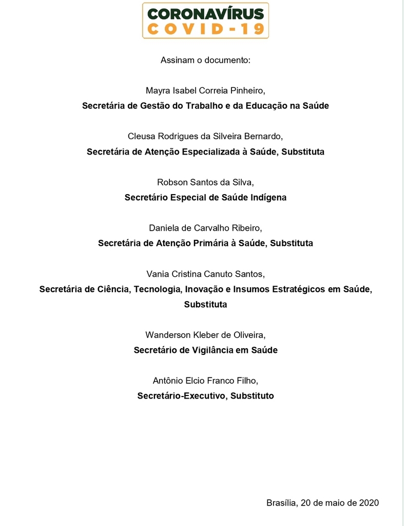 No dia seguinte, 21 de maio, após receber críticas pela falta de assinaturas no protocolo — sequer tinha o logotipo da pasta! –, o Ministério da Saúde divulgou nova versão do documento — com data de 20 de maio — com o nome de todos os secretários da pasta.