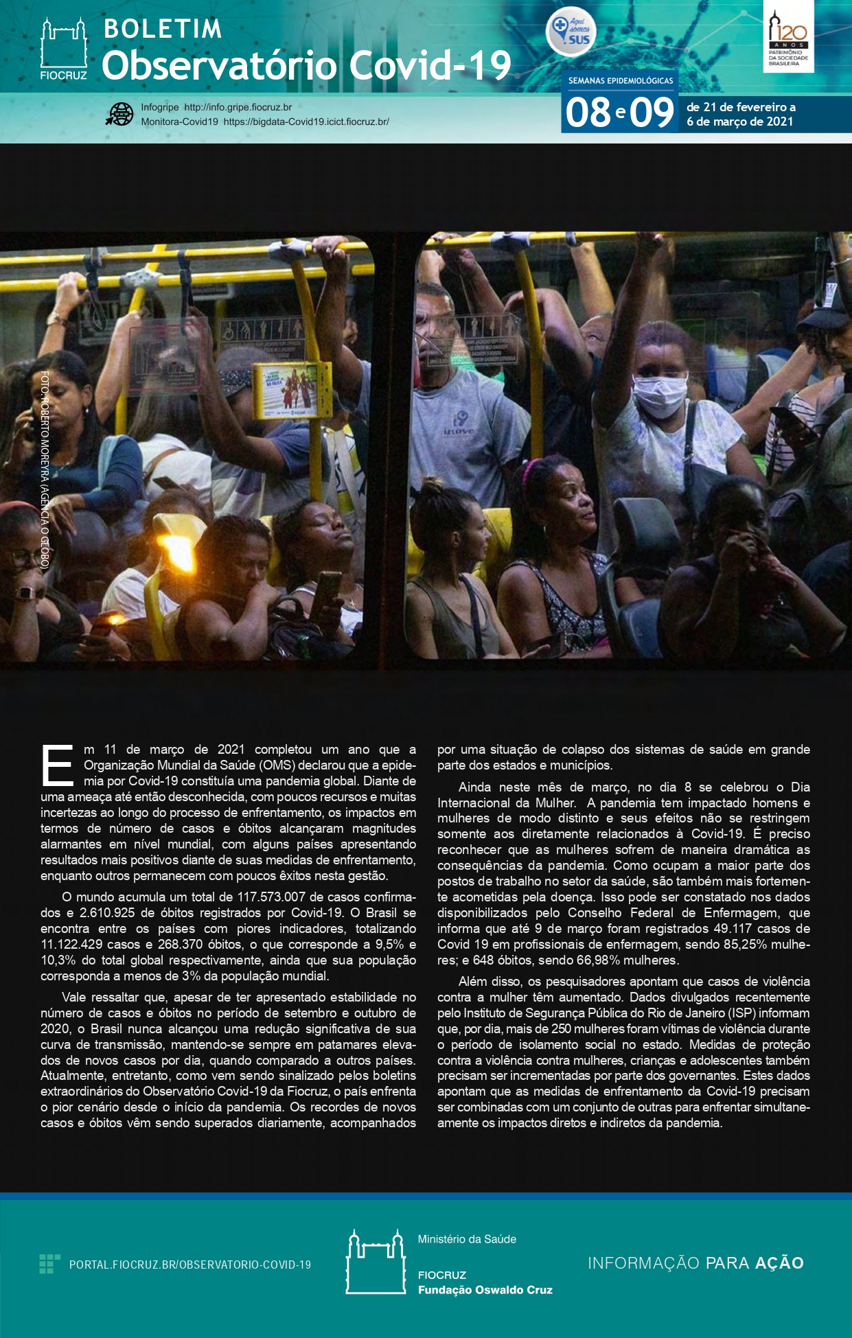 Nesta quinta-feira, 11 de março, um ano desde que a Organização Mundial da Saúde (OMS) declarou que a epidemia por Covid-19 representava uma pandemia global, o novo Boletim do Observatório Covid-19 Fiocruz (na íntegra, ao final) destaca que o Brasil se encontra entre os países com os piores indicadores.