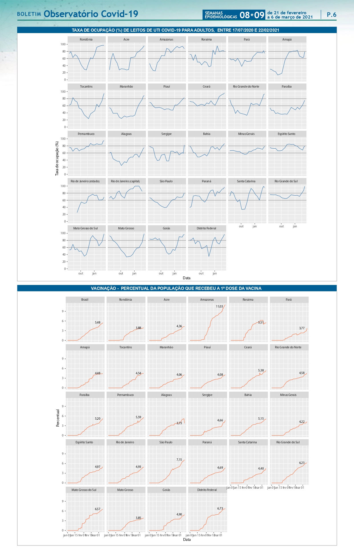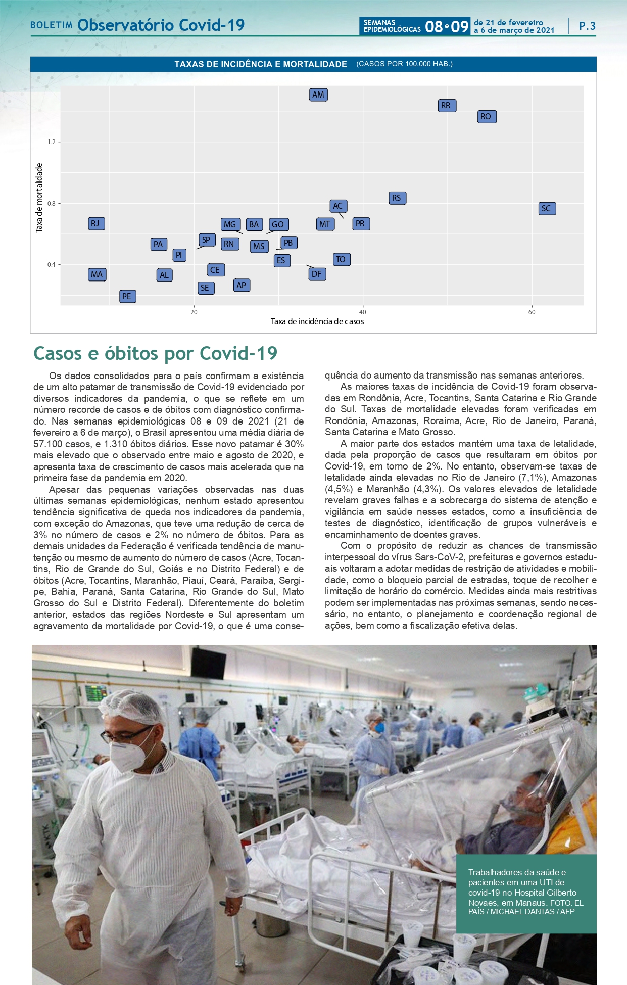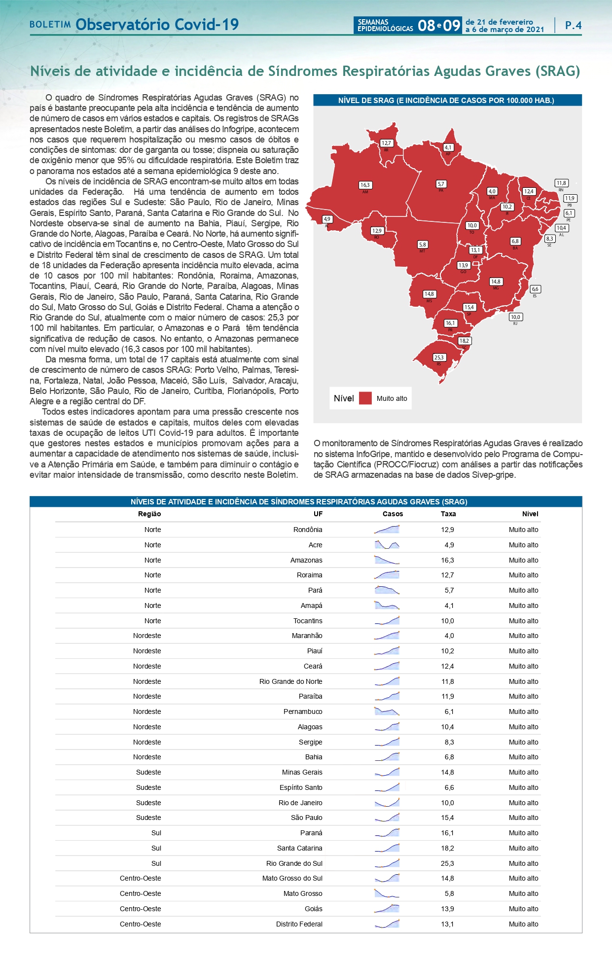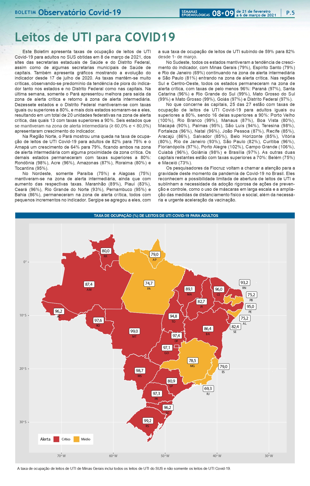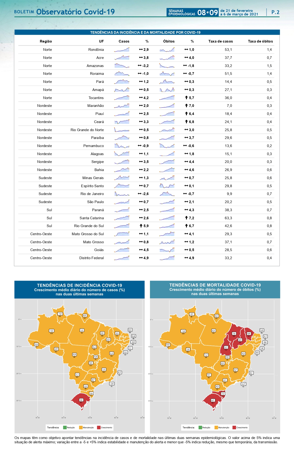 De acordo com o Boletim, as taxas obtidas em 8 de março de 2021 mostram evolução do indicador desde 17 de julho de 2020, apontando uma tendência de piora tanto nos estados e no Distrito Federal, como nas capitais.