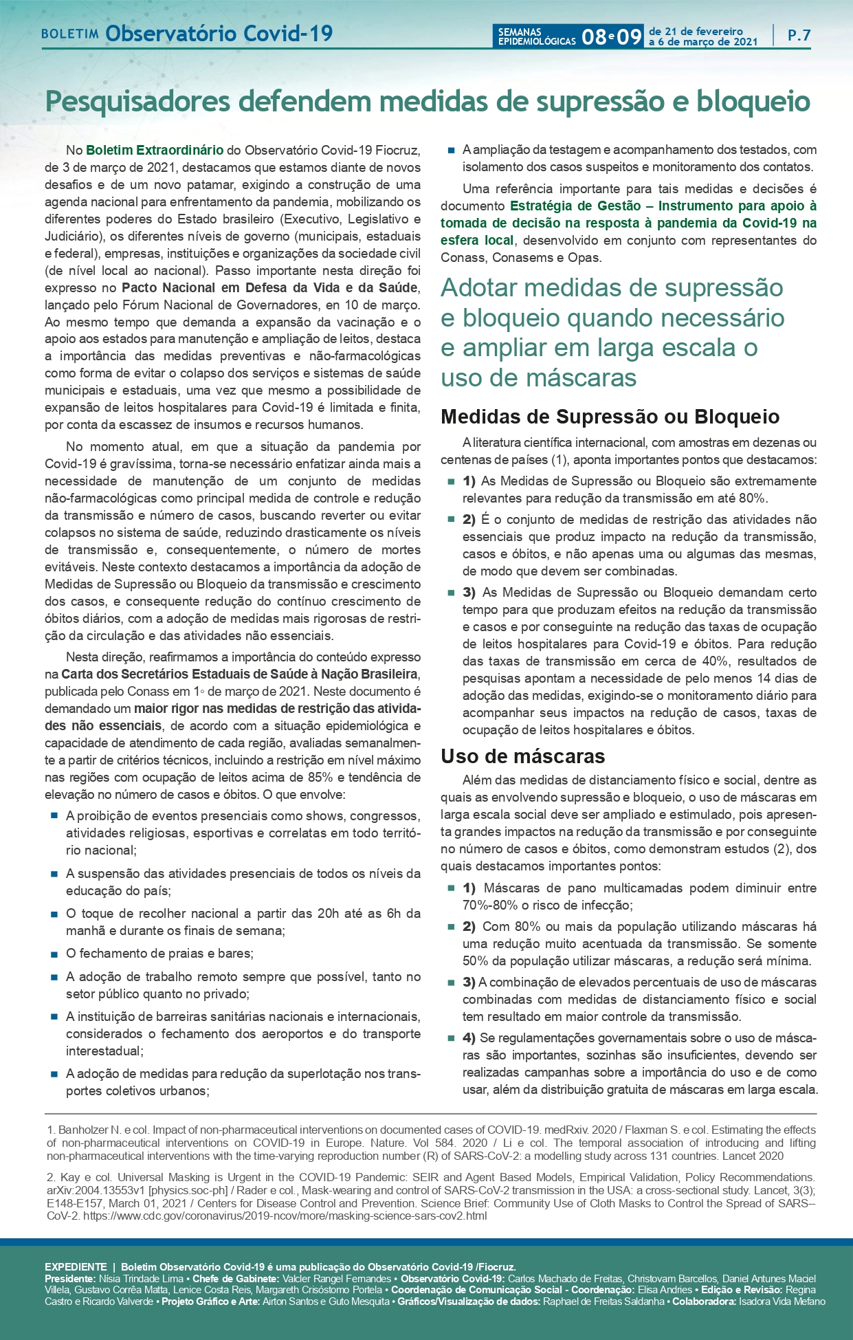 Diante do quadro atual, os pesquisadores defendem como principal medida de controle e redução da transmissão e do número de casos por Covid-19, assim como para a diminuição do contínuo crescimento de óbitos diários, a adoção de “Medidas de Supressão ou Bloqueio”, com incorporação de medidas mais rigorosas de restrição da circulação e das atividades não essenciais. Soma-se a estas medidas o uso de máscaras em larga escala social.