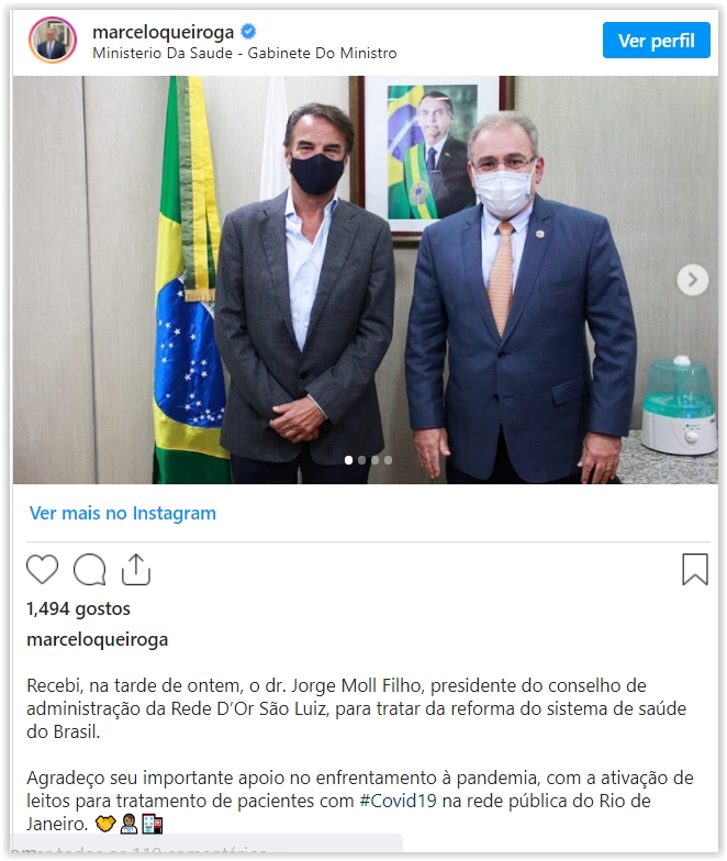 Nessa sexta-feira (22/04), Queiroga recebeu Jorge Moll Filho, presidente da rede D’or São Luiz.
