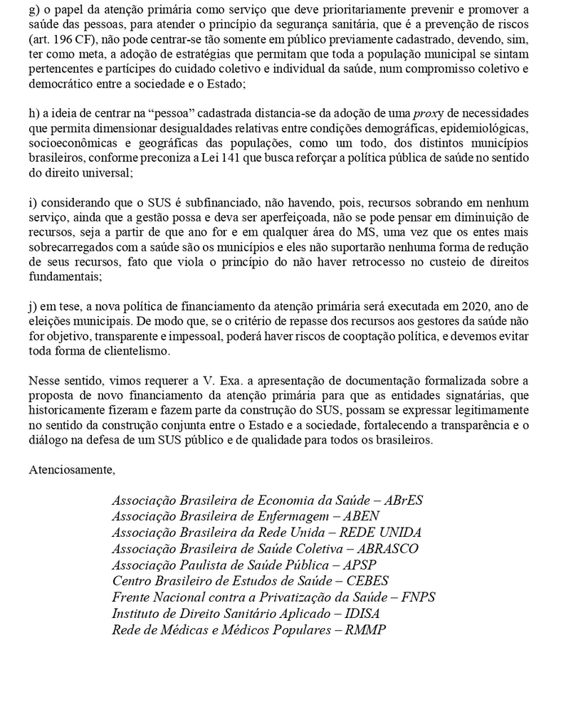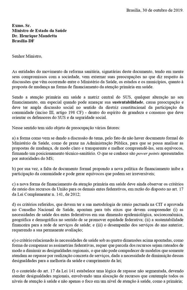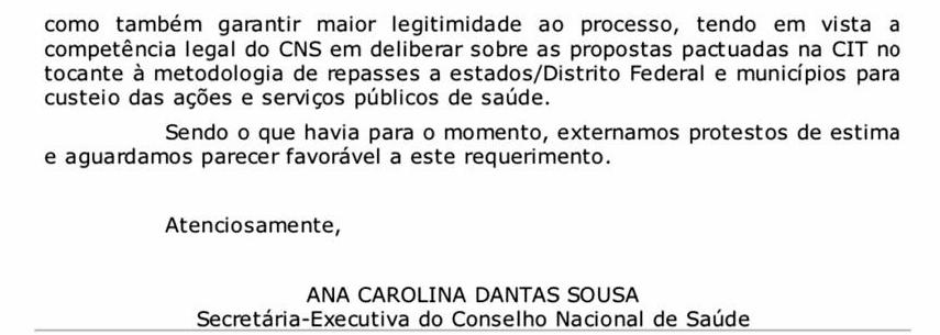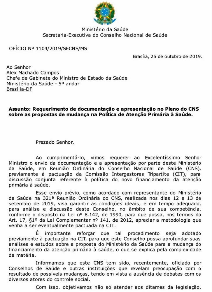 Na semana passada, o Conselho Nacional de Saúde (CNS) solicitou (veja carta abaixo) ao chefe de gabinete do ministro da Saúde o envio de toda a documentação sobre a mudança na política de financiamento da atenção primária.