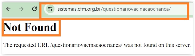 — a URL/questionáriovacinaçaocrianca/não foi encontrada neste servidor (do CFM), diz a mensagem em resposta à sua demanda.