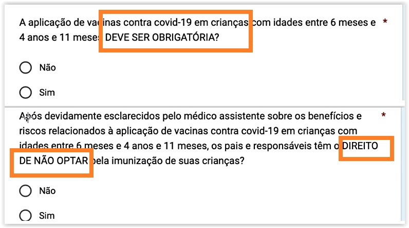 As duas últimas perguntas, com DEVE SER OBRIGATÓRIA e DIREITO DE NÃO OPTAR em letras maiúsculas, escancaram o jogo e a intenção. Na última, cometem ainda a tentativa de trocar obrigatoriedade por opção.