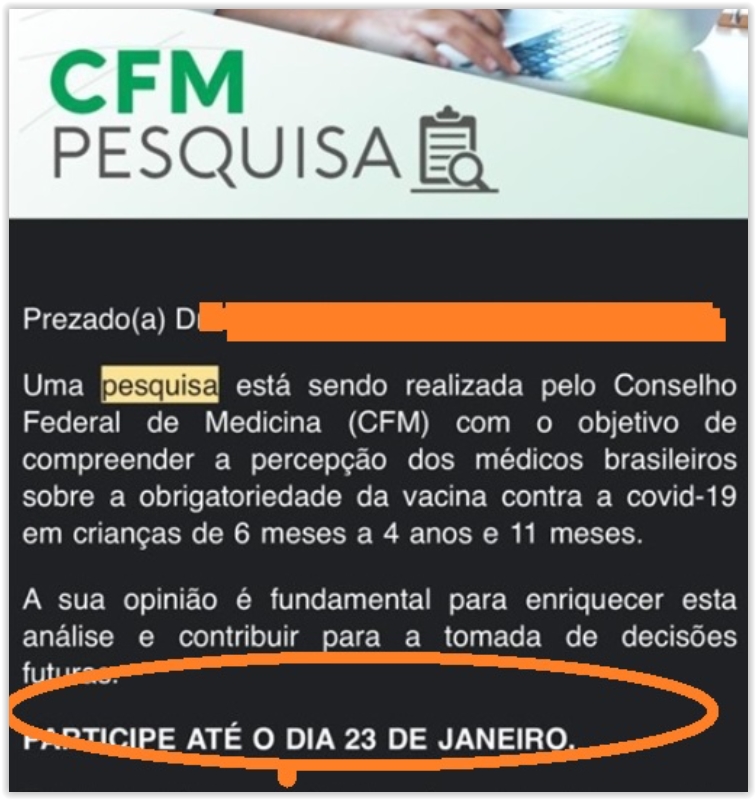 Na mensagem enviada aos aos seus associados por e-mail, o CFM destaca em letras maiúsculas: PARTICIPE ATÉ O DIA 23 DE JANEIRO