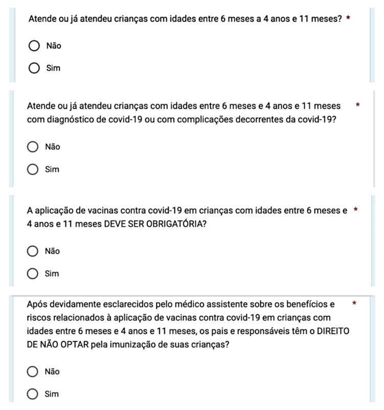 Além disso, no caso da ”pesquisa” do CFM, as perguntas com flagrante viés sinalizavam que o objetivo era, sim, instrumentalizar o movimento antivacinal.