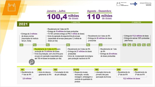 A partir do recebimento desses insumos, a Fiocruz tem previsão de entregar ao Programa Nacional de Imunizações (PNI) do Ministério da Saúde (MS), em março, 15 milhões de doses da vacina.