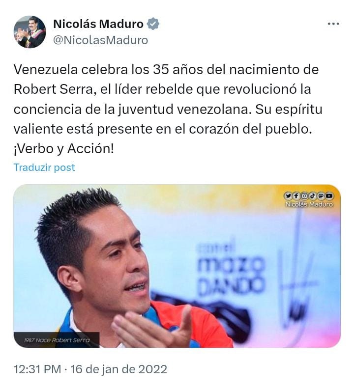 Guardo este recorte de um tuíte do Maduro, em 2022, dois meses após eu ter estado com a juventude venezuelana e aprendido sobre o jovem mártir.
