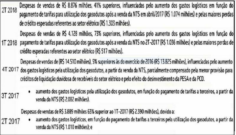 Porém, o que a PETROBRAS esconde é que a venda da NTS representou um imenso prejuízo para a Estatal o que ficou devidamente comprovado pelos Relatório ao Mercado Financeiro – RMF – a partir do segundo trimestre de 2017, publicado pela PETROBRAS (http://www.investidorpetrobras.com.br/pt/resultados-financeiros/holding).