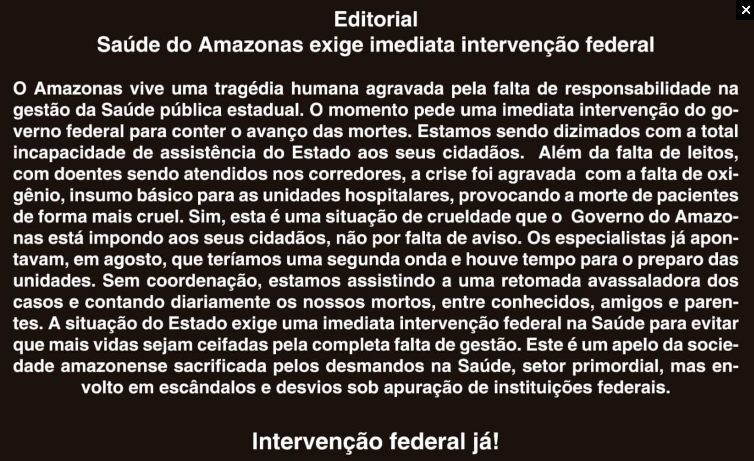 Diante do desespero testemunhado, o site pediu intervenção federal imediata no Amazonas.