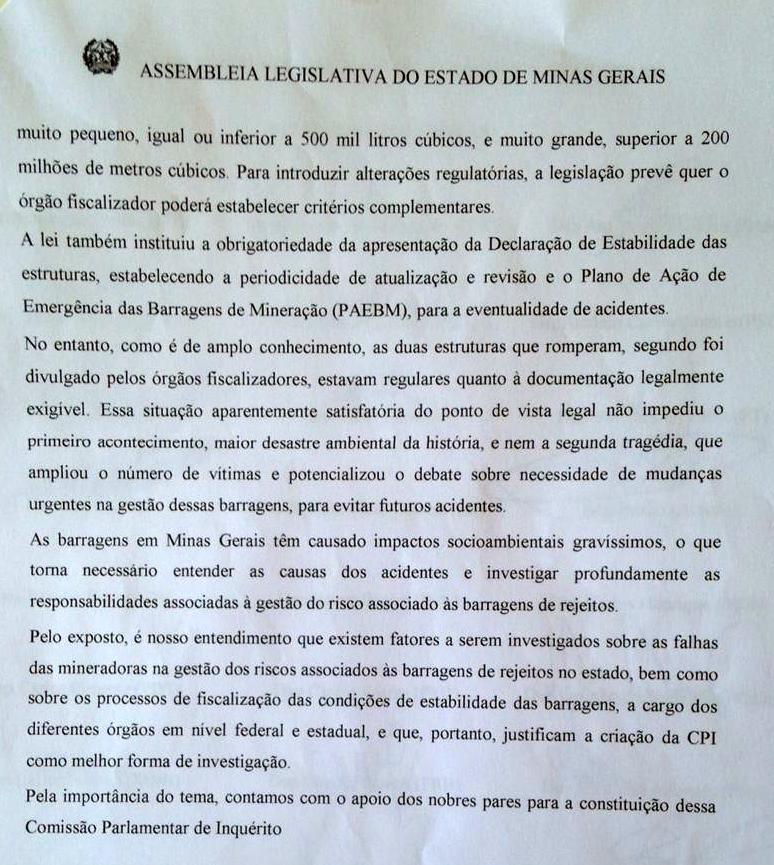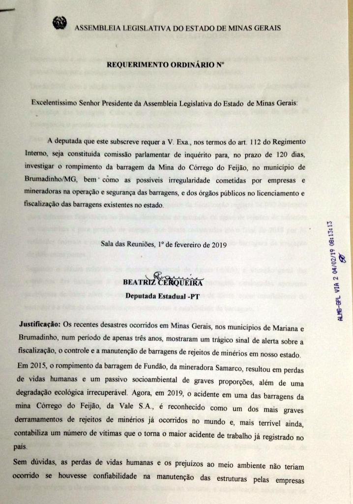Às 8h13 desta segunda-feira, 4/02, a deputada estadual Beatriz Cerqueira (PT-MG) protocolou na Assembleia Legislativa de Minas Gerais (ALEMG) pedido para instalação da CPI das Mineradoras.